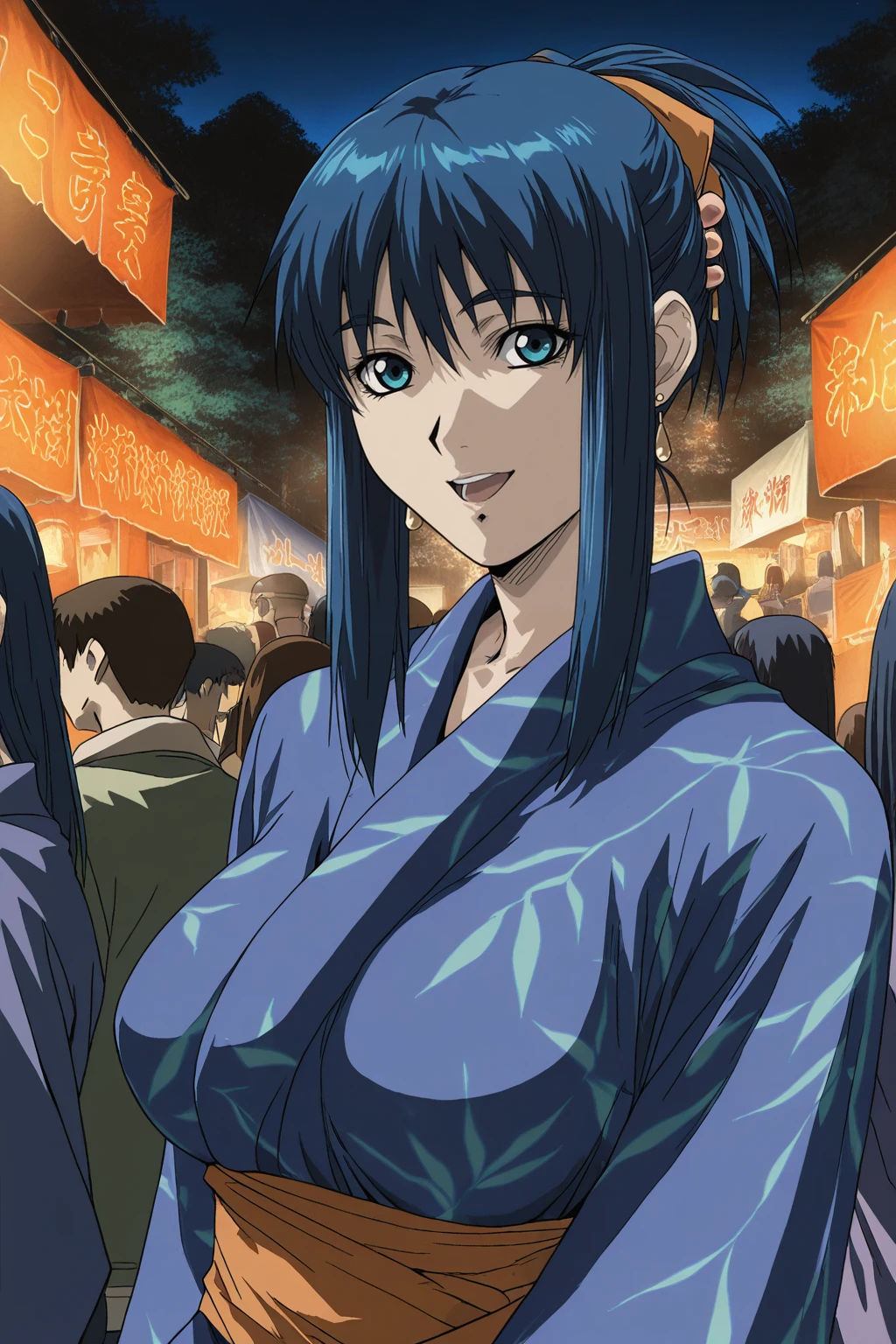 izyi dgmid 3,anime screencap,Hiroko,1girl,solo,blue hair,ponytail,blue eyes,earrings,large breasts,japanese clothes,blue kimono,yukata,tabi socks,geta,