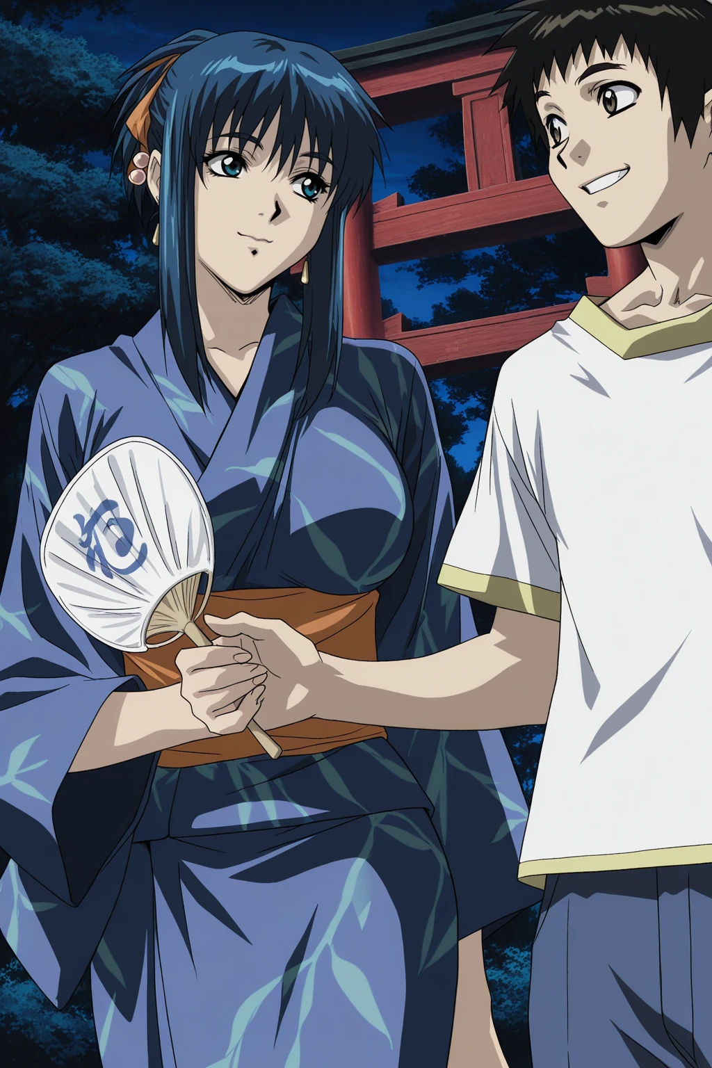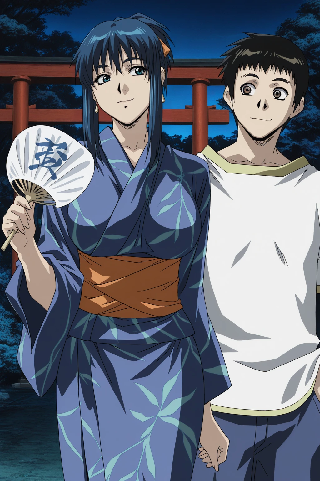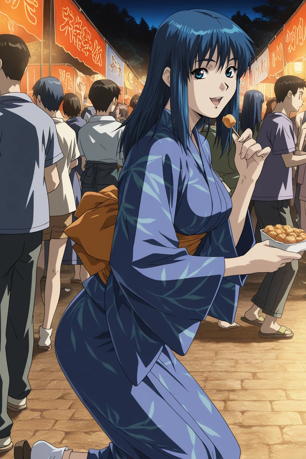 • izyi dgmid 3,anime screencap,Hiroko,1girl,solo,blue hair,ponytail,blue eyes,earrings,large breasts,japanese clothes,blue kimono,yukata,tabi socks,geta,