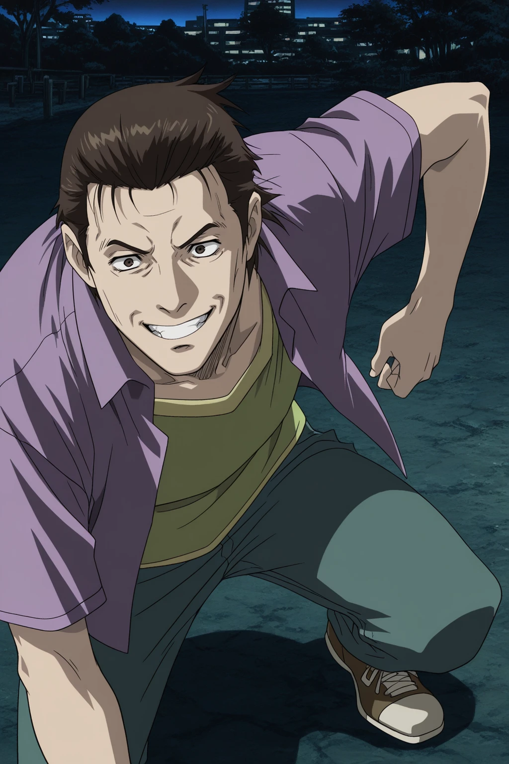 • izyi dgmid 3,anime screencap,Aniki,1boy,solo,brown hair,brown eyes,short hair,hair back,slicked hair,brown skin male,muscular male,(square face male:1.4),purple shirt,green t-shirt,collared shirt,short sleeves,smile,open clothes,pants,shoes,