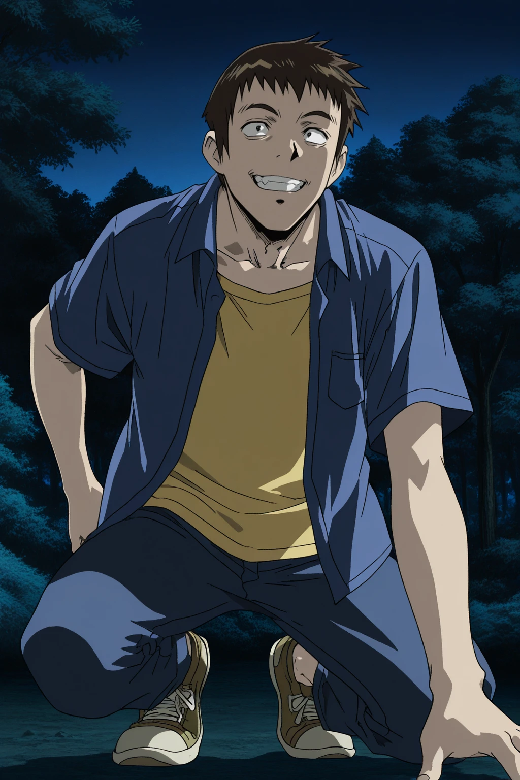 izyi dgmid 3,anime screencap,Yase,1boy,solo,brown hair,short hair,thin male,blue shirt,collared shirt,short sleeves,yellow t-shirt,,pants,shoes,