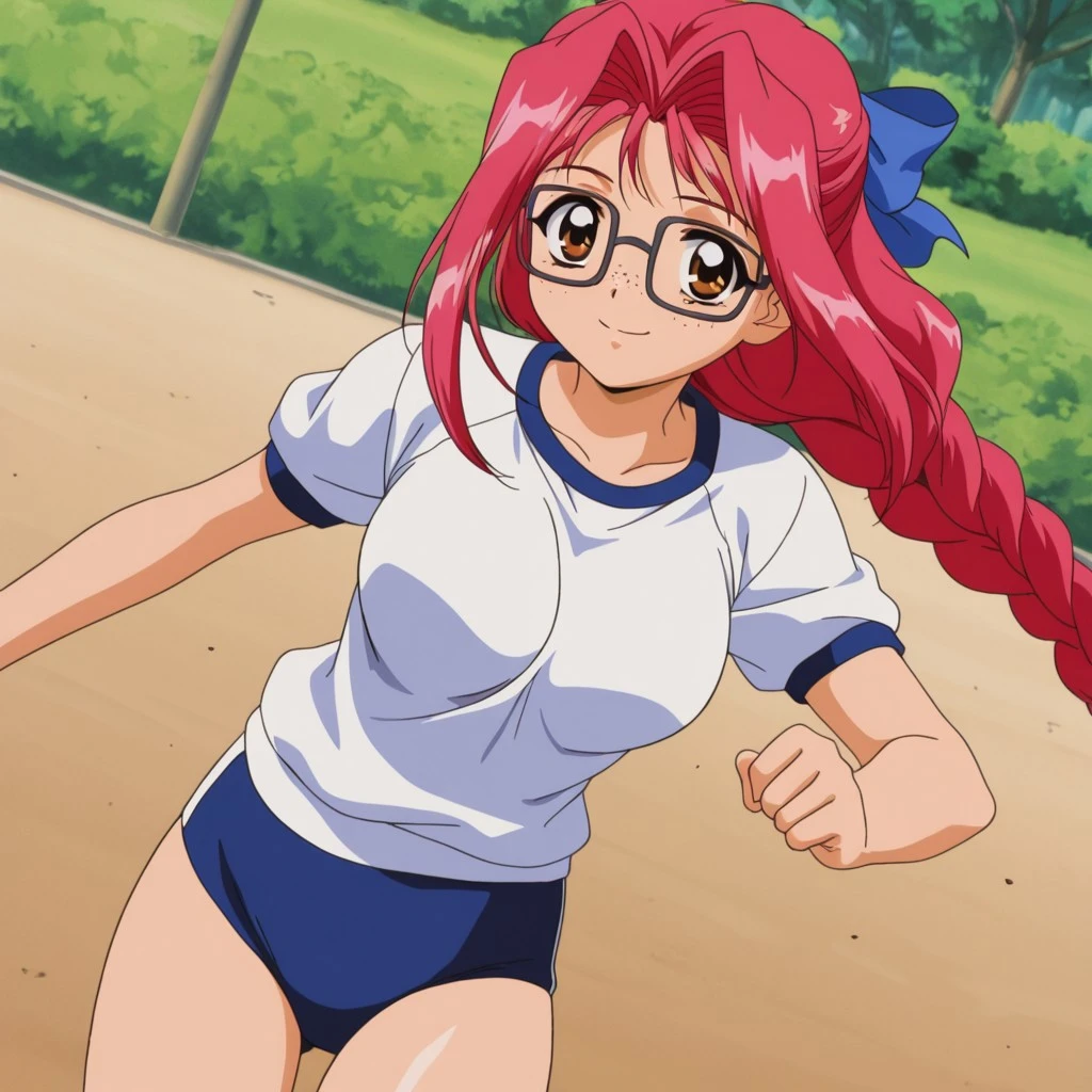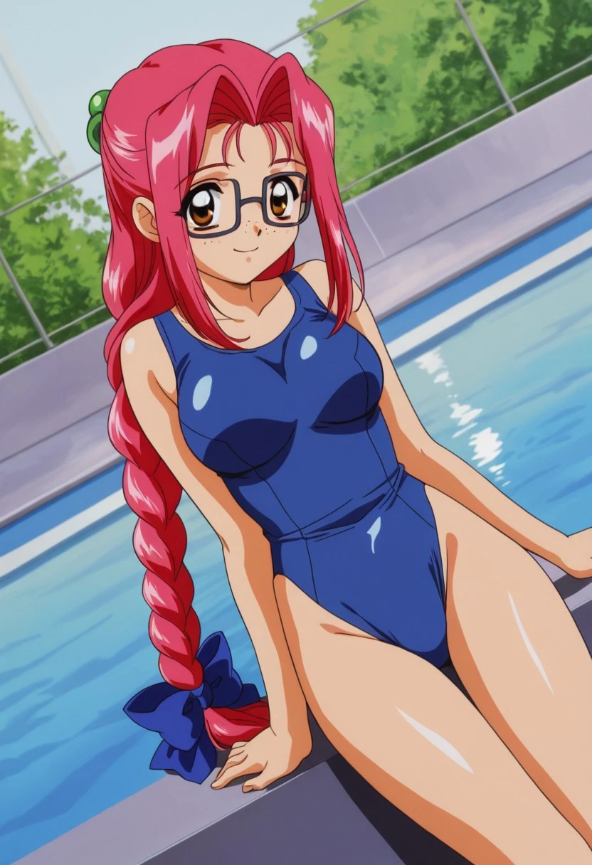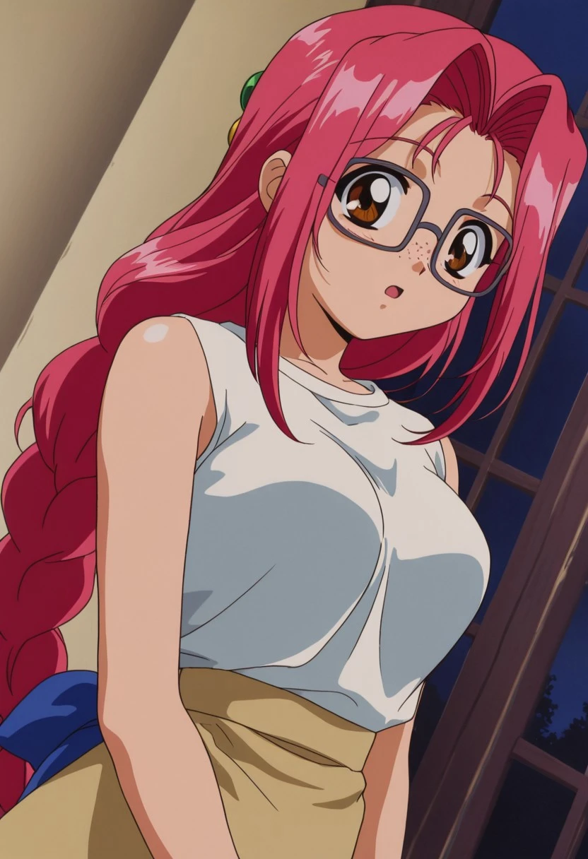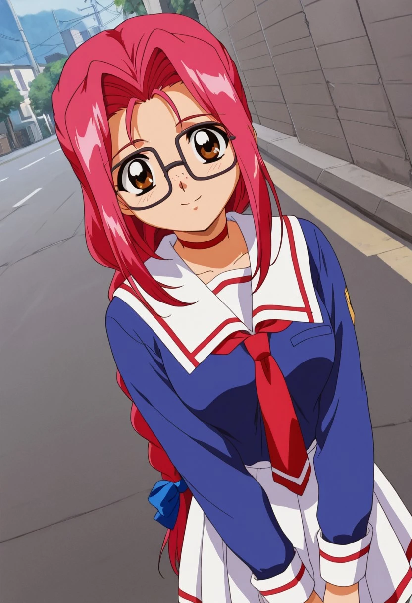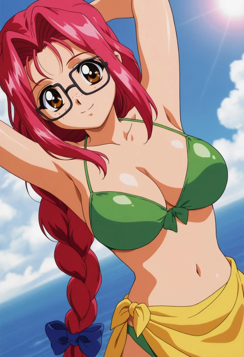 Trigger: Mafuyu, brown eyes, long hair, reddish pink hair, hair ornaments in the form of green spheres behind the head, long ponytail in the form of a braid and in front, large blue bow in the braid, sidelocks, thick square glasses,freckles, large breasts, young adult,