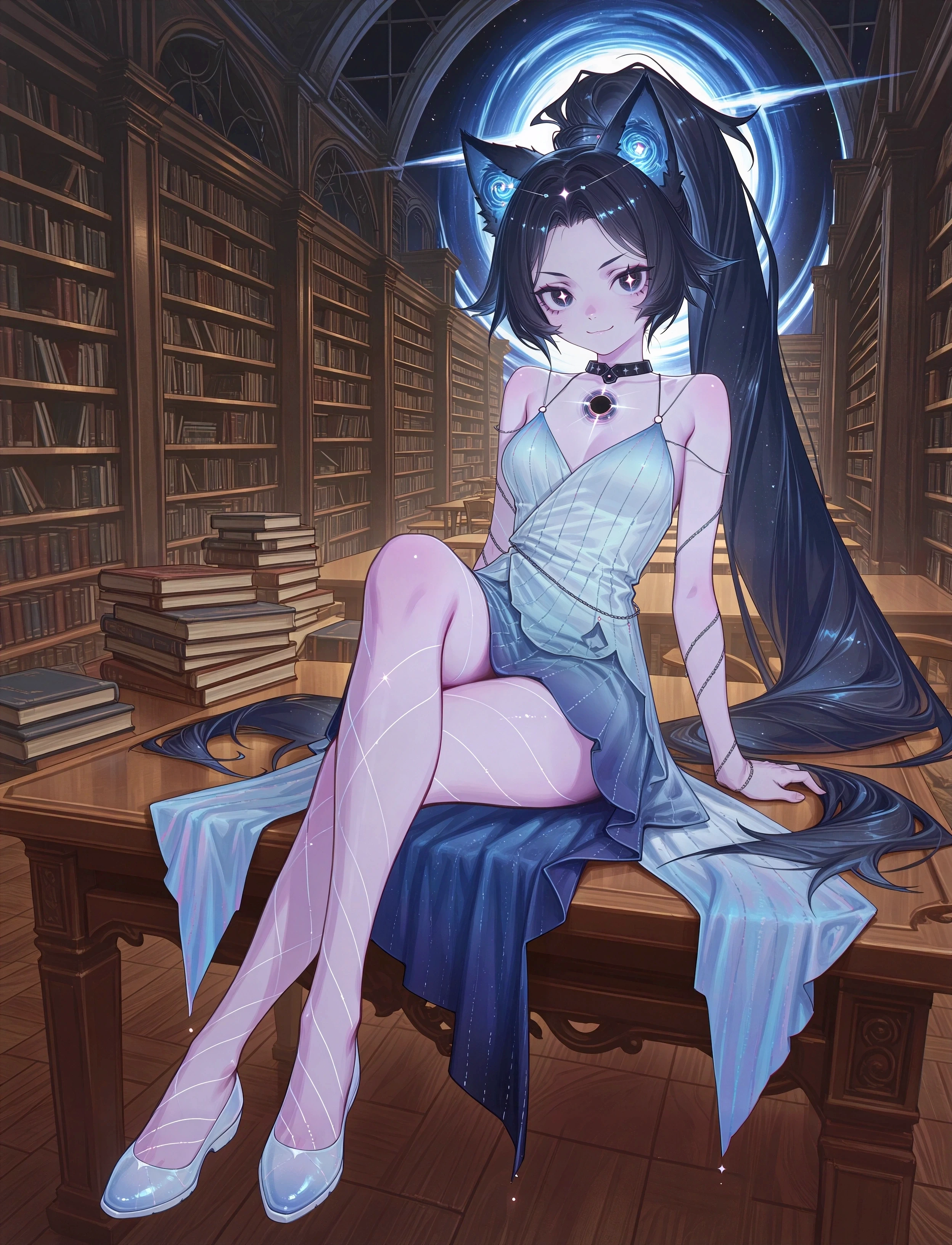 fufu \(white dress\), black hair, star-shaped pupils, animal ears, high ponytail,