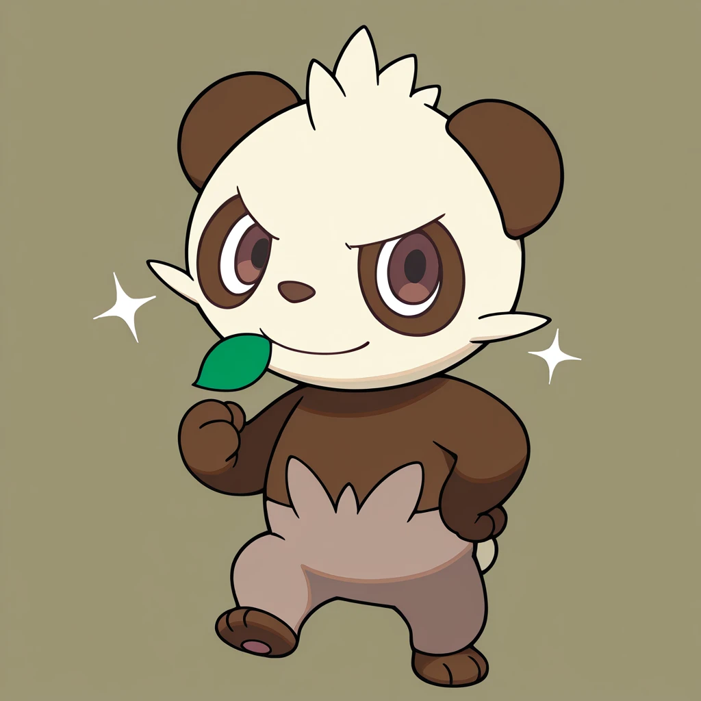 Tags (Shiny): shiny pokemon, pokemon (creature), leaf in mouth, mouth hold, panda, white head, brown nose, brown ears, brown circles around eyes, brown eyes, brown body, white tail,
