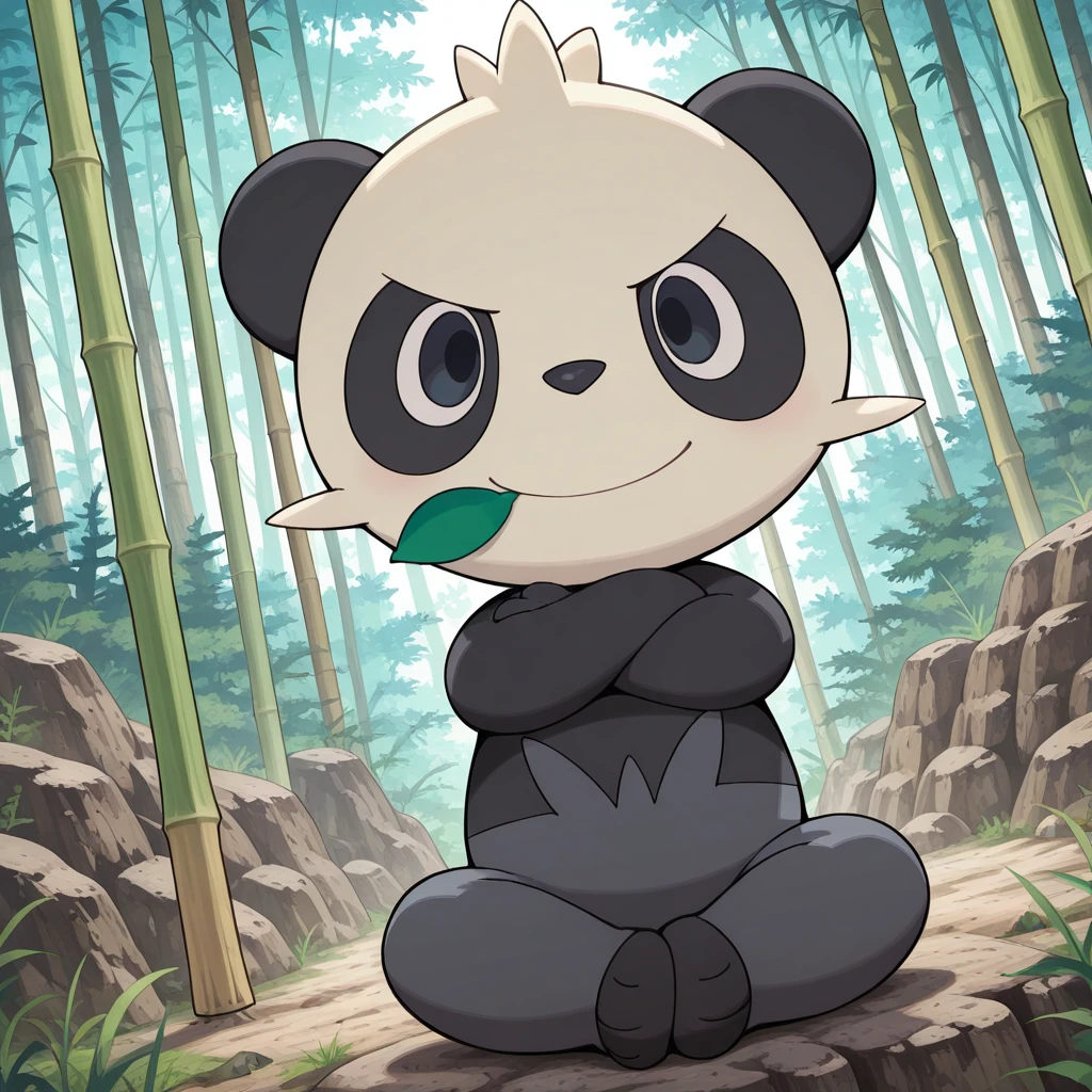 Tags: pokemon (creature), leaf in mouth, mouth hold, panda, white head, black nose, black ears, black circles around eyes, black eyes, black and gray body,