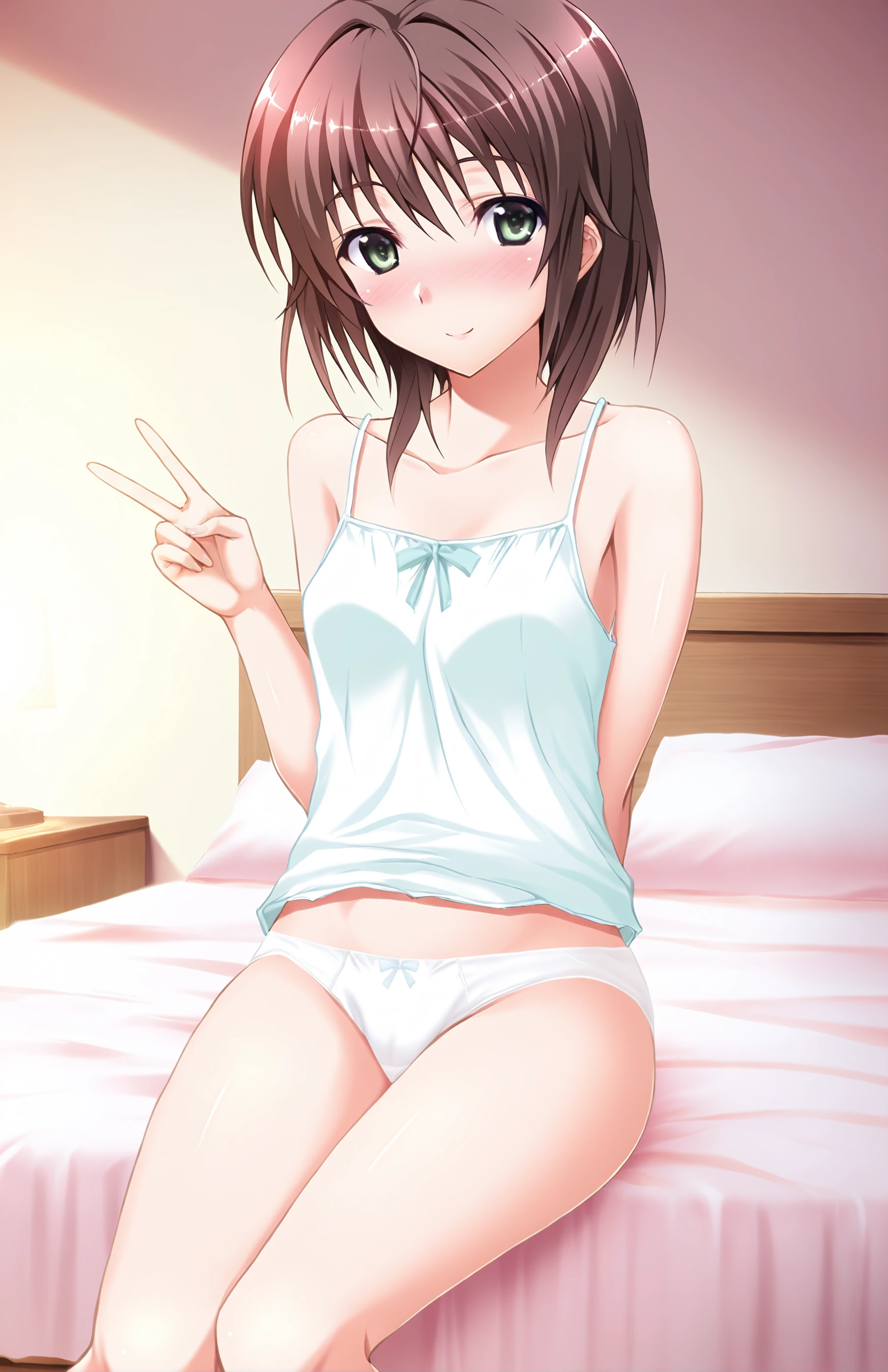YakumoMiyu, short hair, brown hair, underwear, green eyes, panties, white panties, bow panties, light aqua camisole