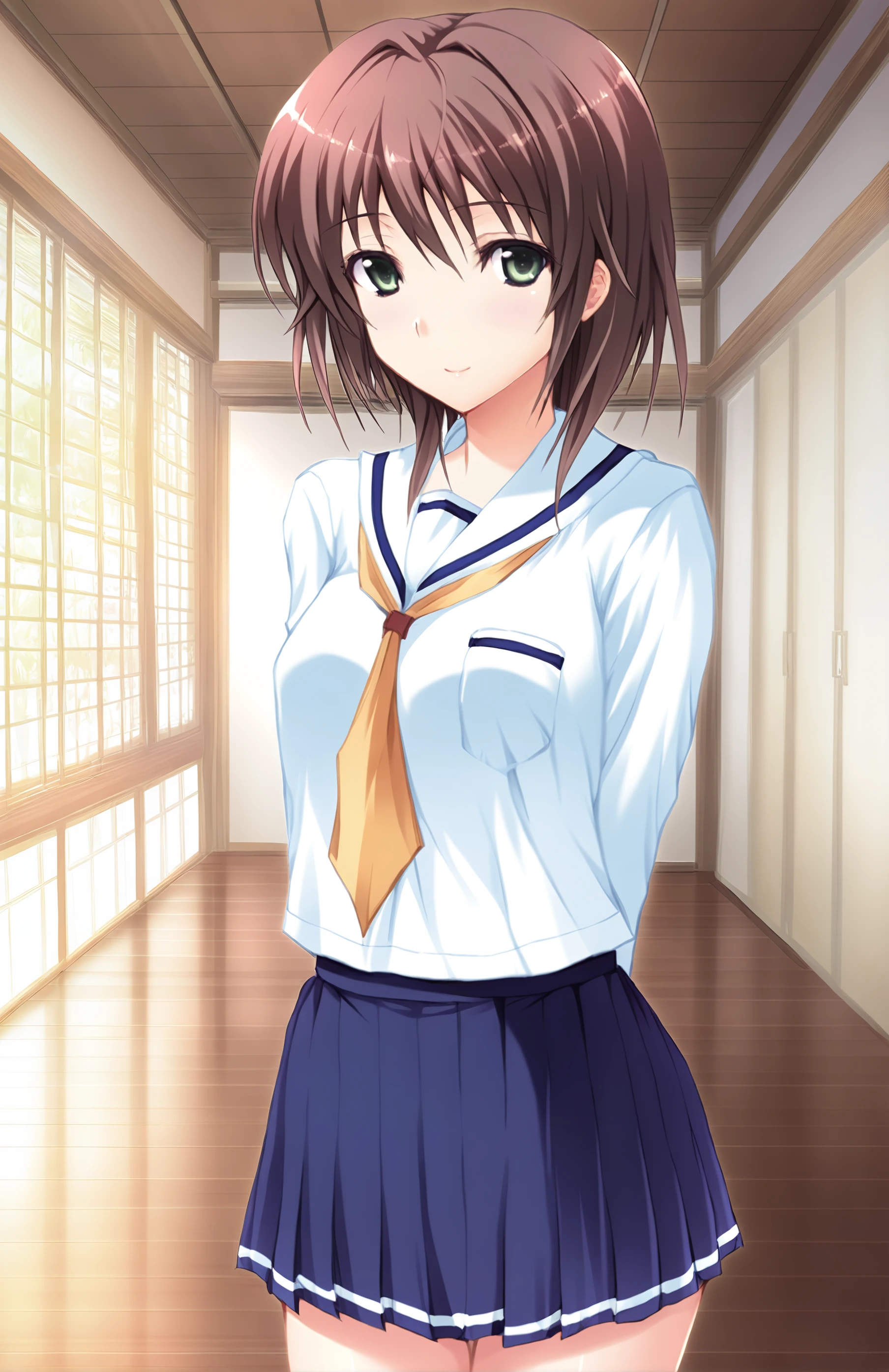 YakumoMiyu, short hair, skirt, brown hair, school uniform, green eyes, blue skirt, pleated skirt, white shirt, serafuku