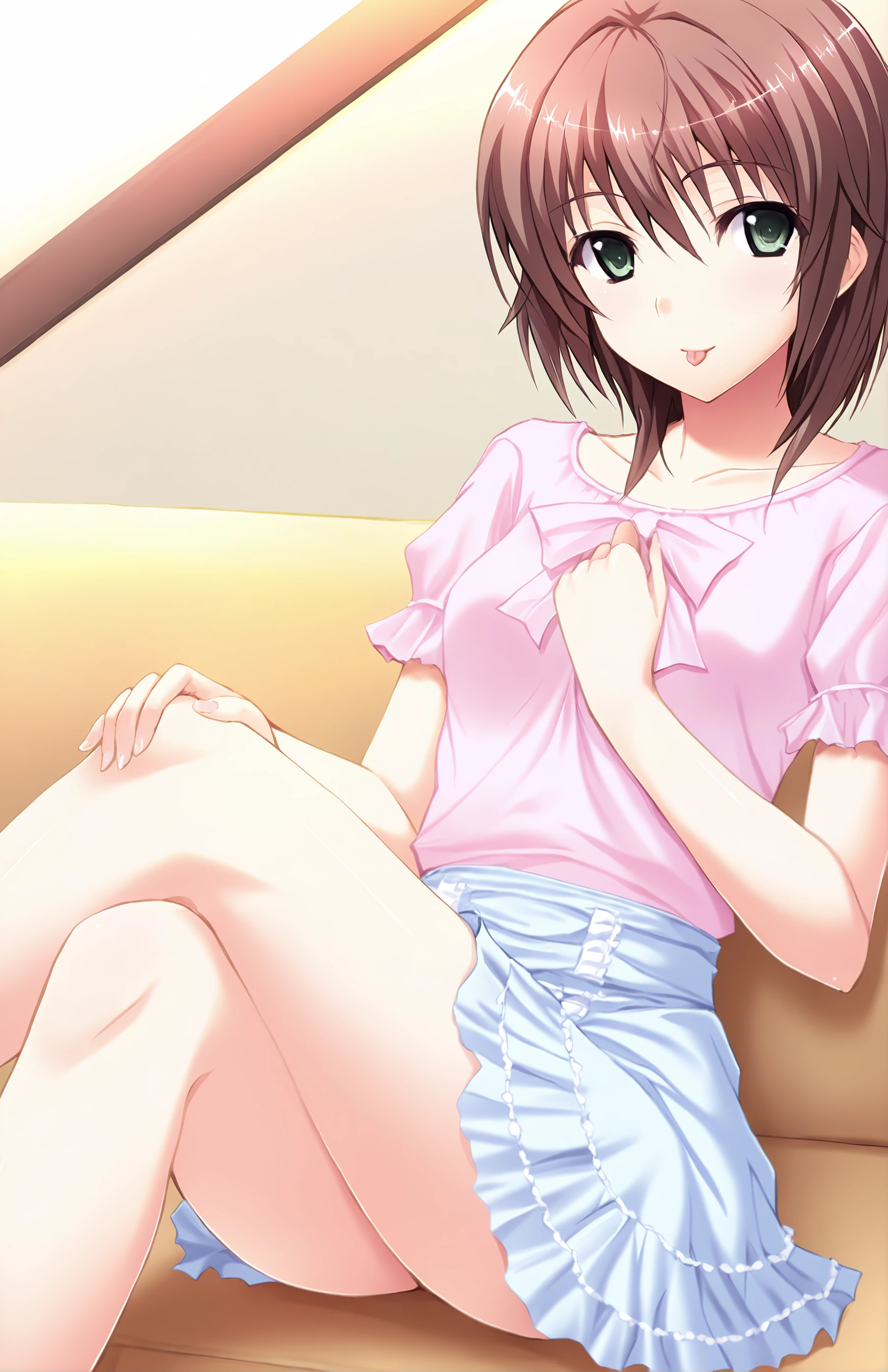 YakumoMiyu, short hair, skirt, brown hair, shirt, bow, hair between eyes, green eyes, collarbone, short sleeves, frills, miniskirt, light blue skirt, pink shirt