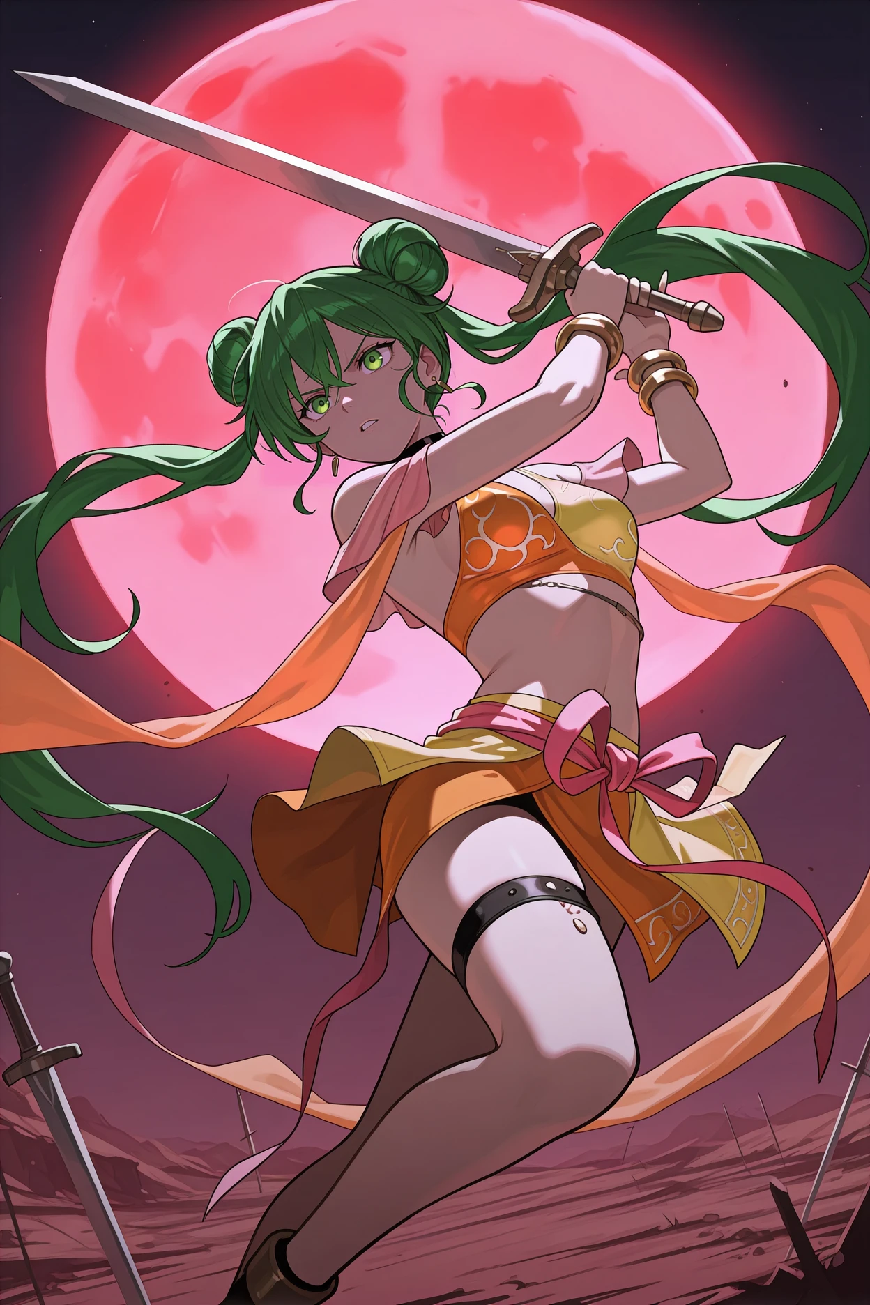 Trigger word is "slvafe" and "twintails, double bun, green hair, very long hair, green eyes" is required.