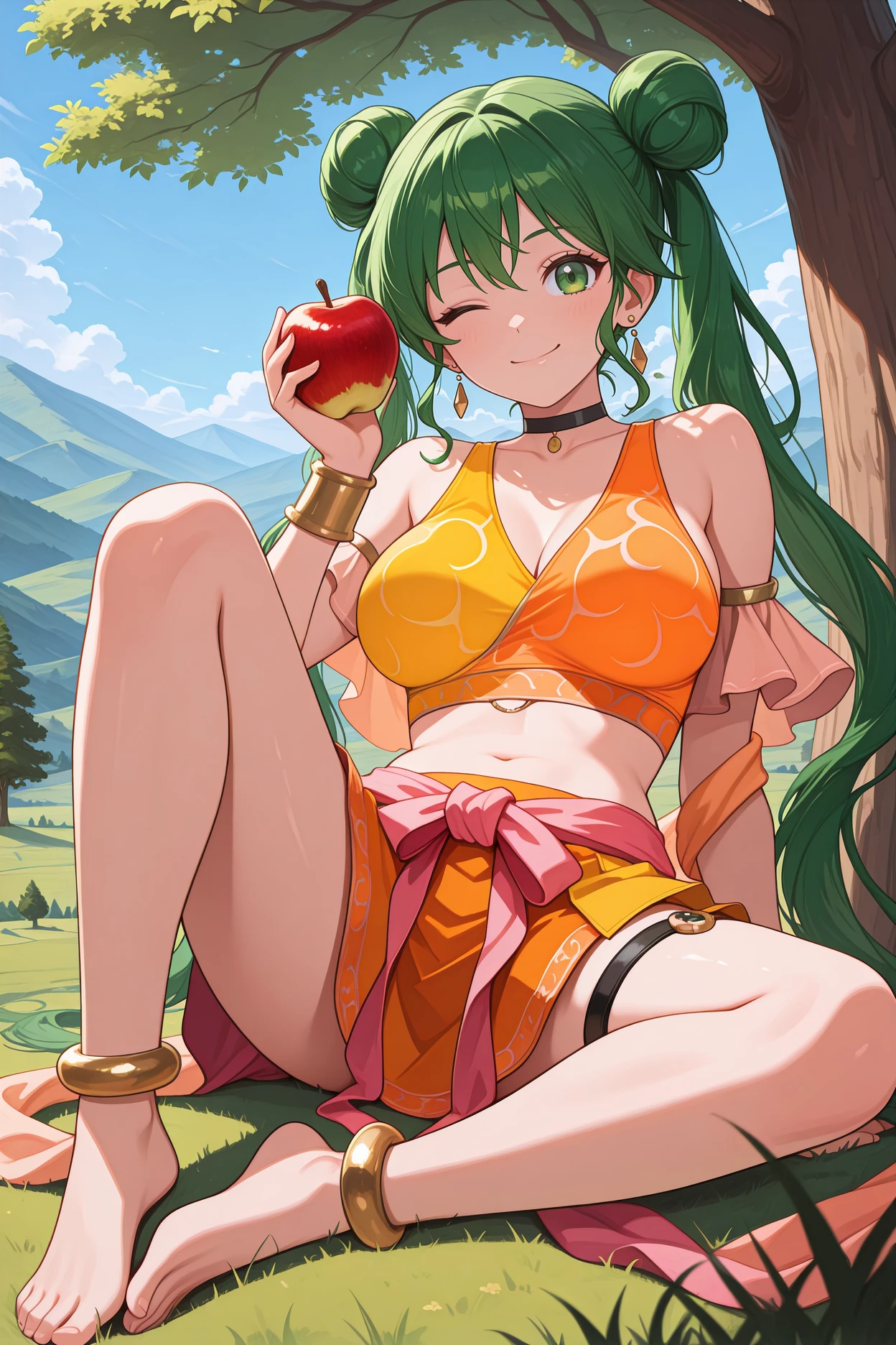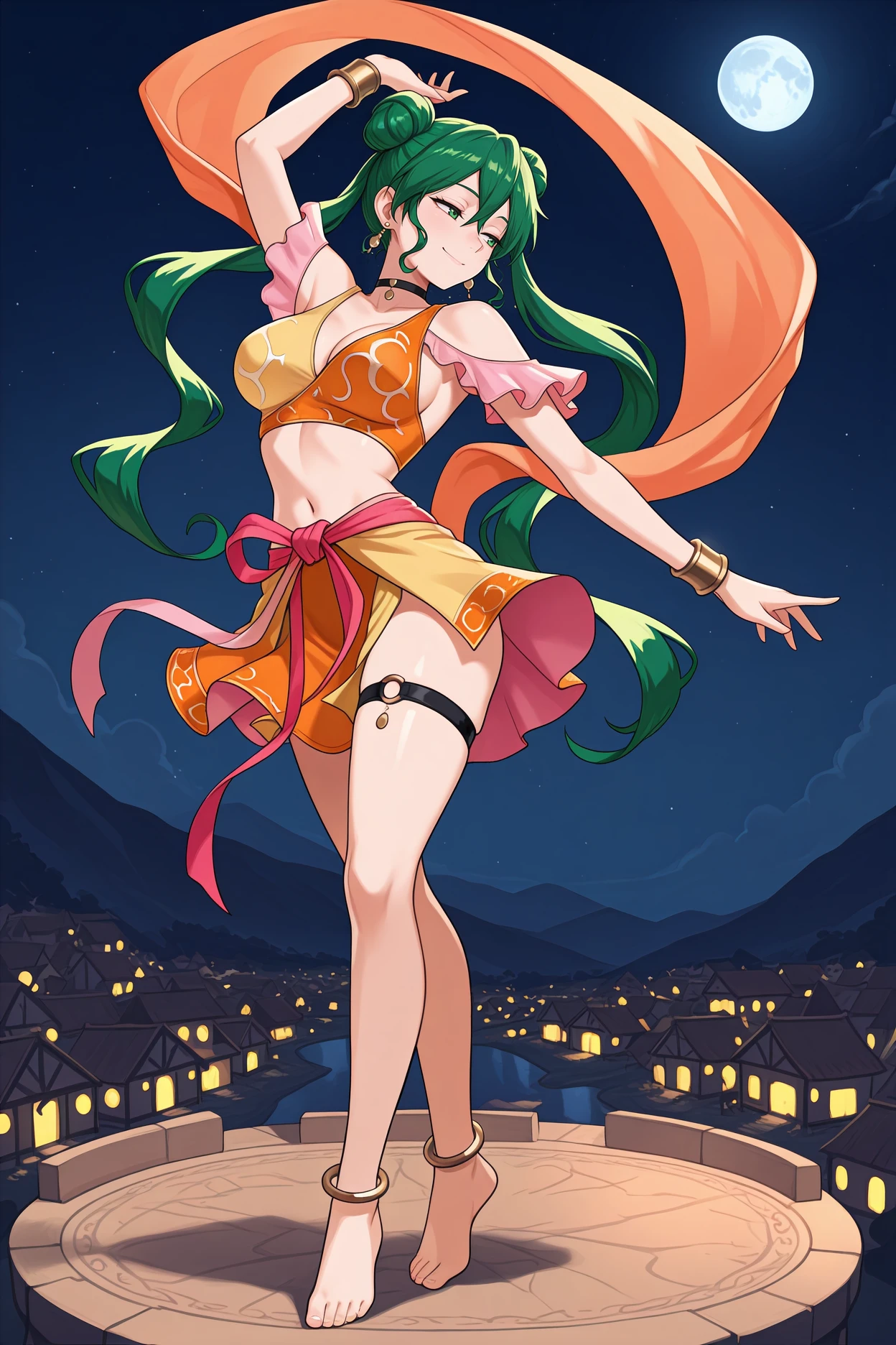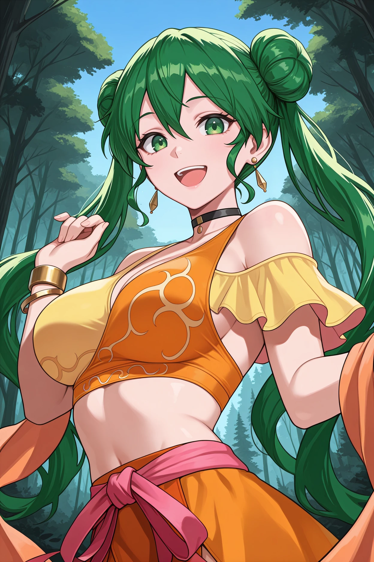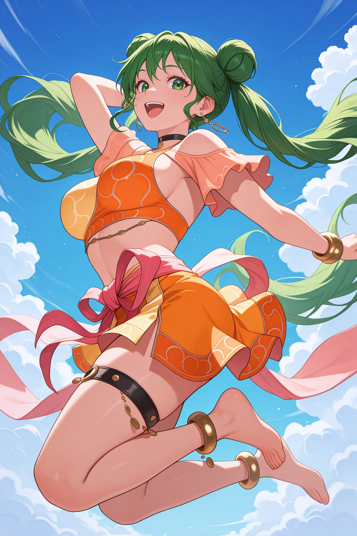 Add "earrings, black choker, two-tone shirt, yellow crop top, orange crop top, midriff, orange shawl, gold bracelet, pink sash, orange skirt, thigh strap, gold anklet, barefoot" for her typical look.