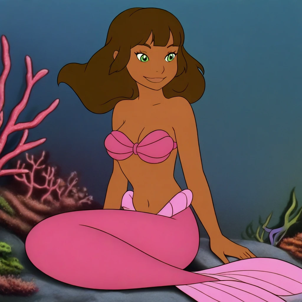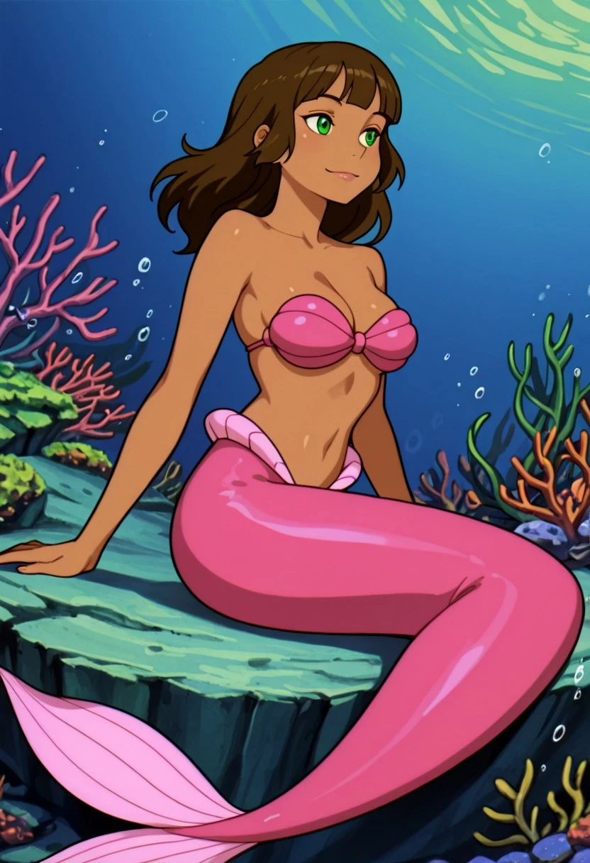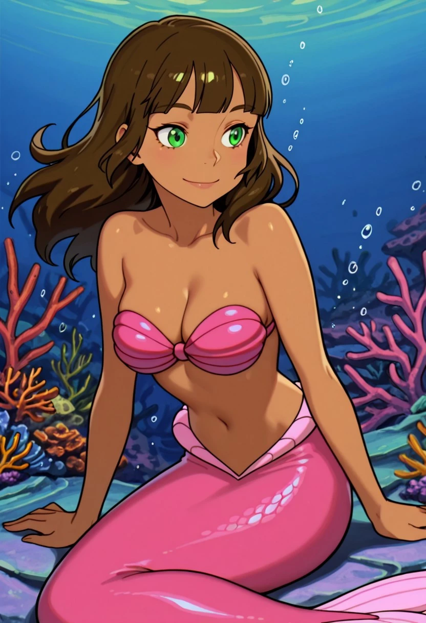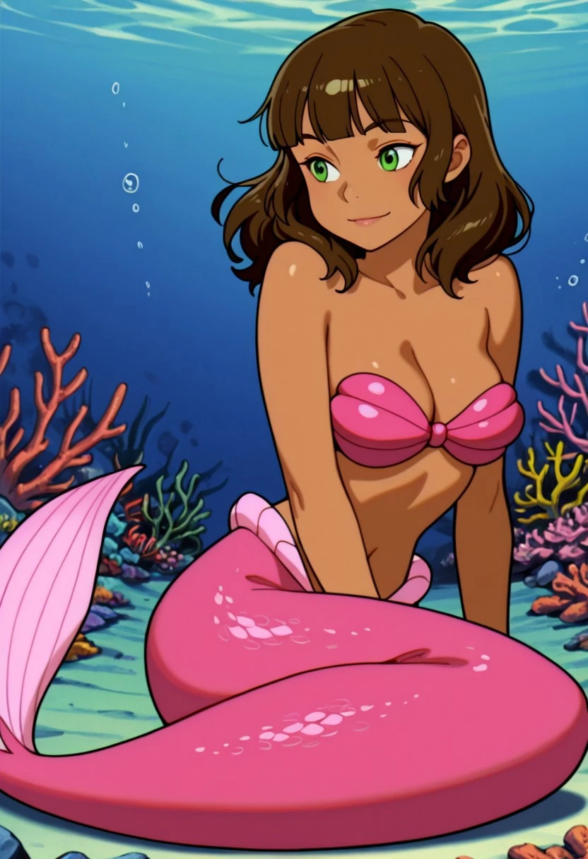 brown hair, long hair, blunt bangs, green eyes, dark-skinned female, medium breasts, monster girl, mermaid, pink tail, scales