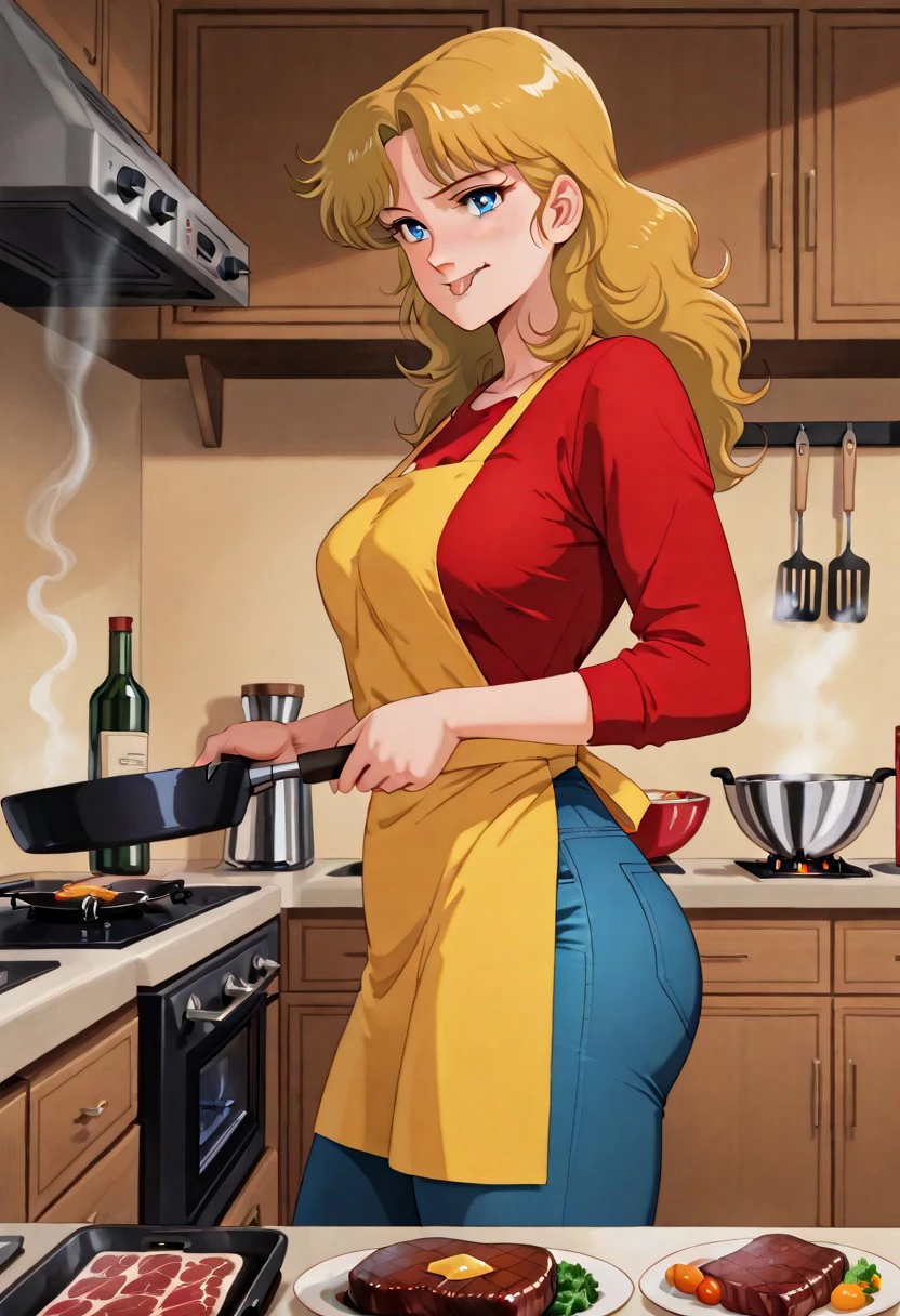 OUTFIT 10: long sleeves, red shirt, denim, blue jeans, yellow apron, kitchen room, stove, holding, frying pan, (Cooking with her up into French Gourmet!)