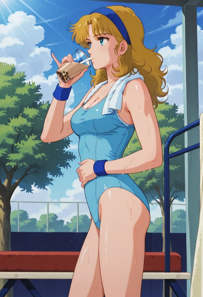 OUTFIT 9: 80s gym leotard, blue leotard, socks, sneakers, white tanktop, sweatbands, head sweatband, blue wristband,