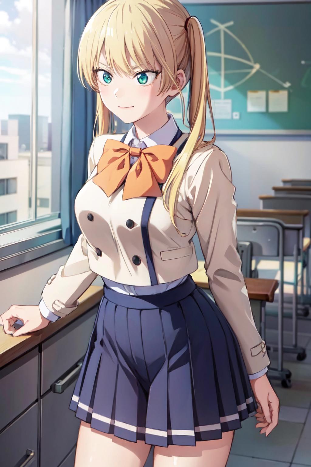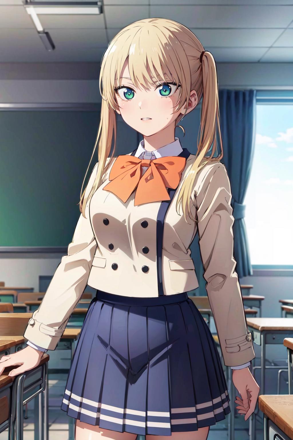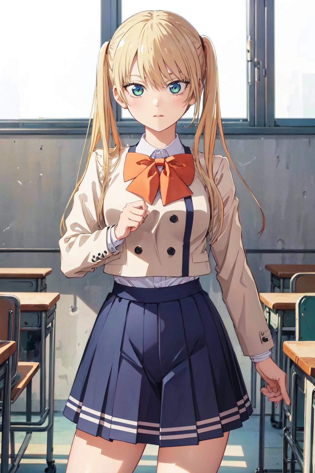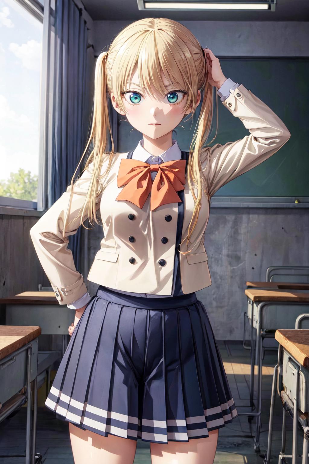 ((best quality, high quality, highres)), rika hoshizaki, school uniform, classroom, solo, 1girl, cowboy shot