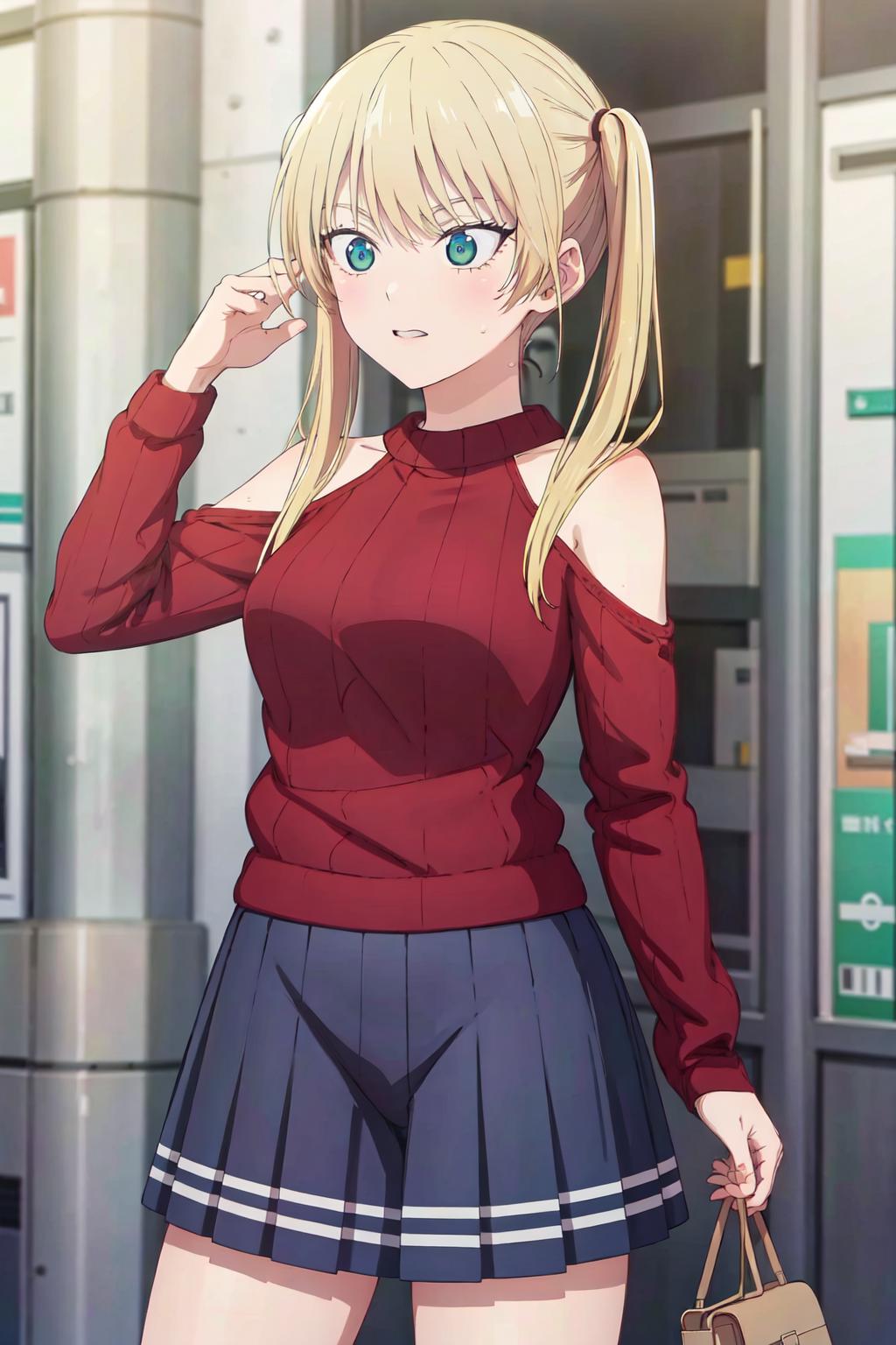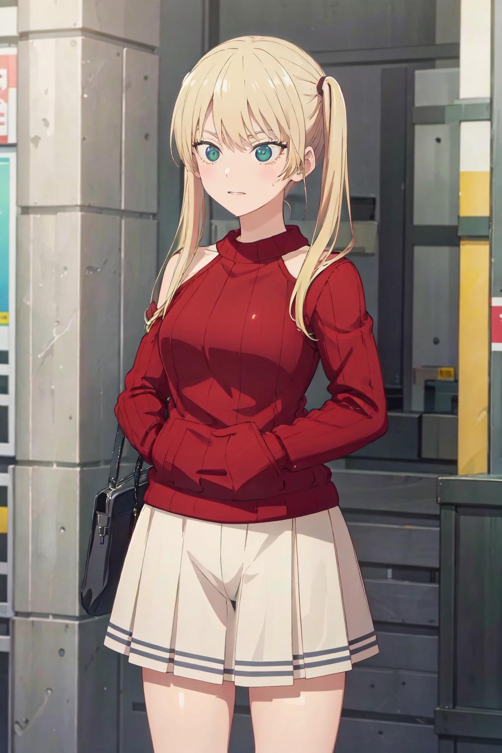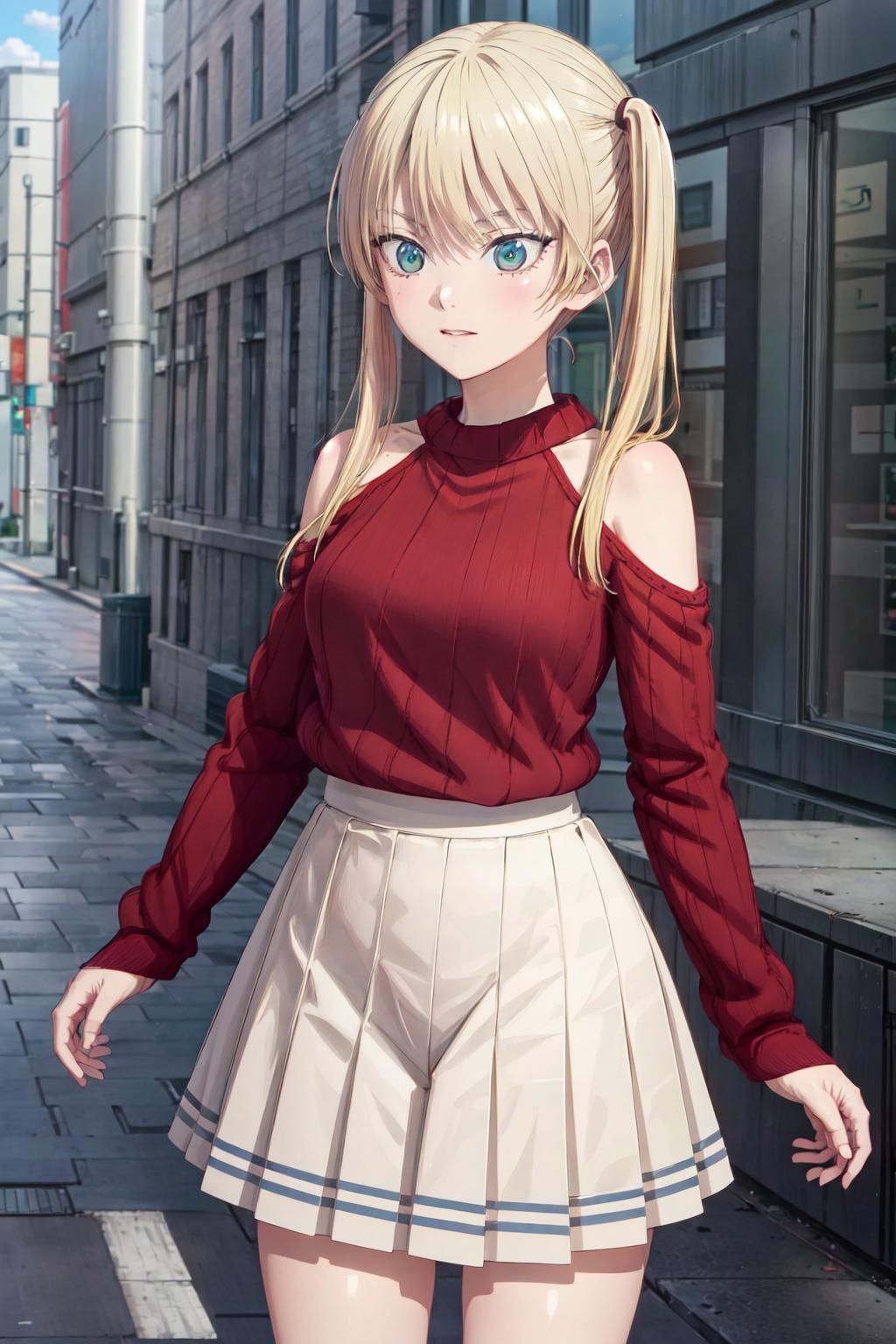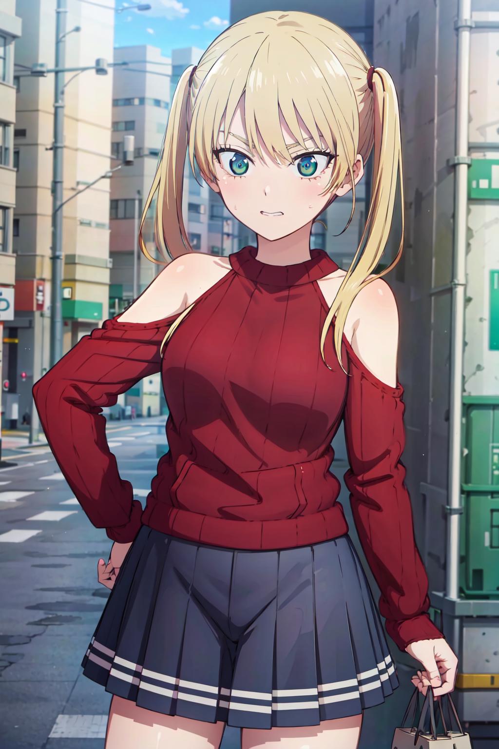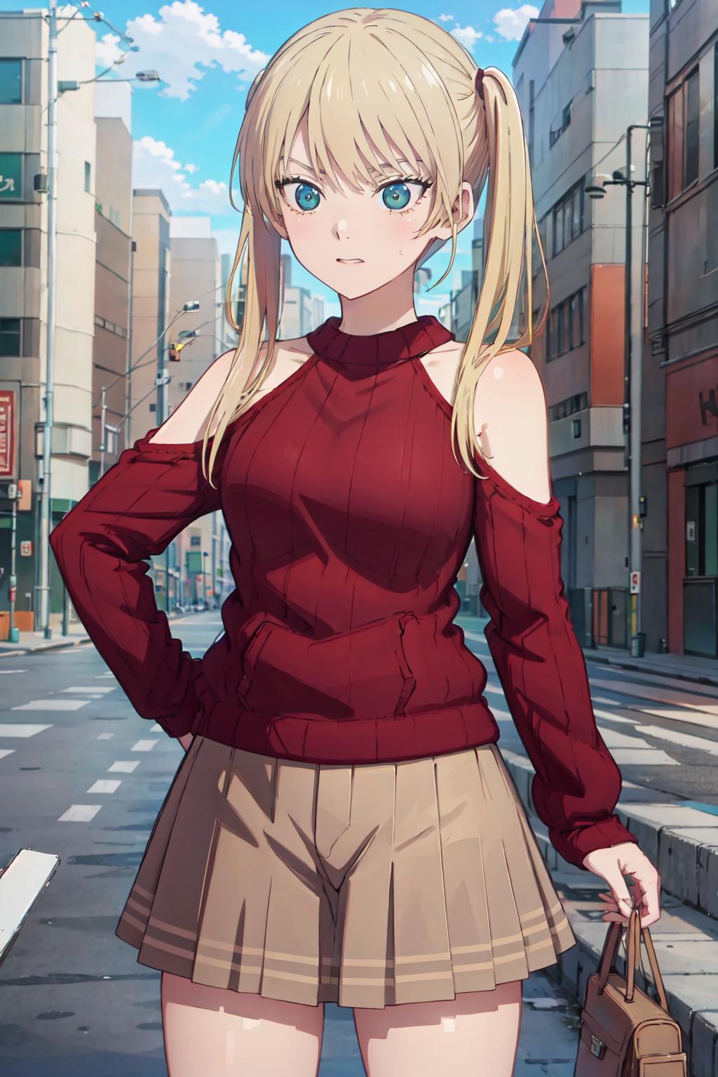 ((best quality, high quality, highres)), rika hoshizaki, red sweater, street, tokyo, solo, 1girl, cowboy shot