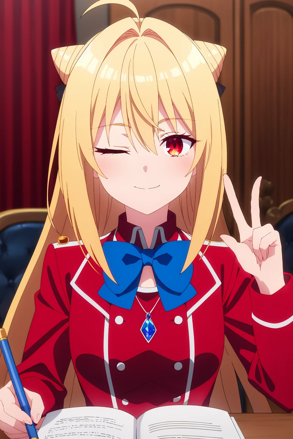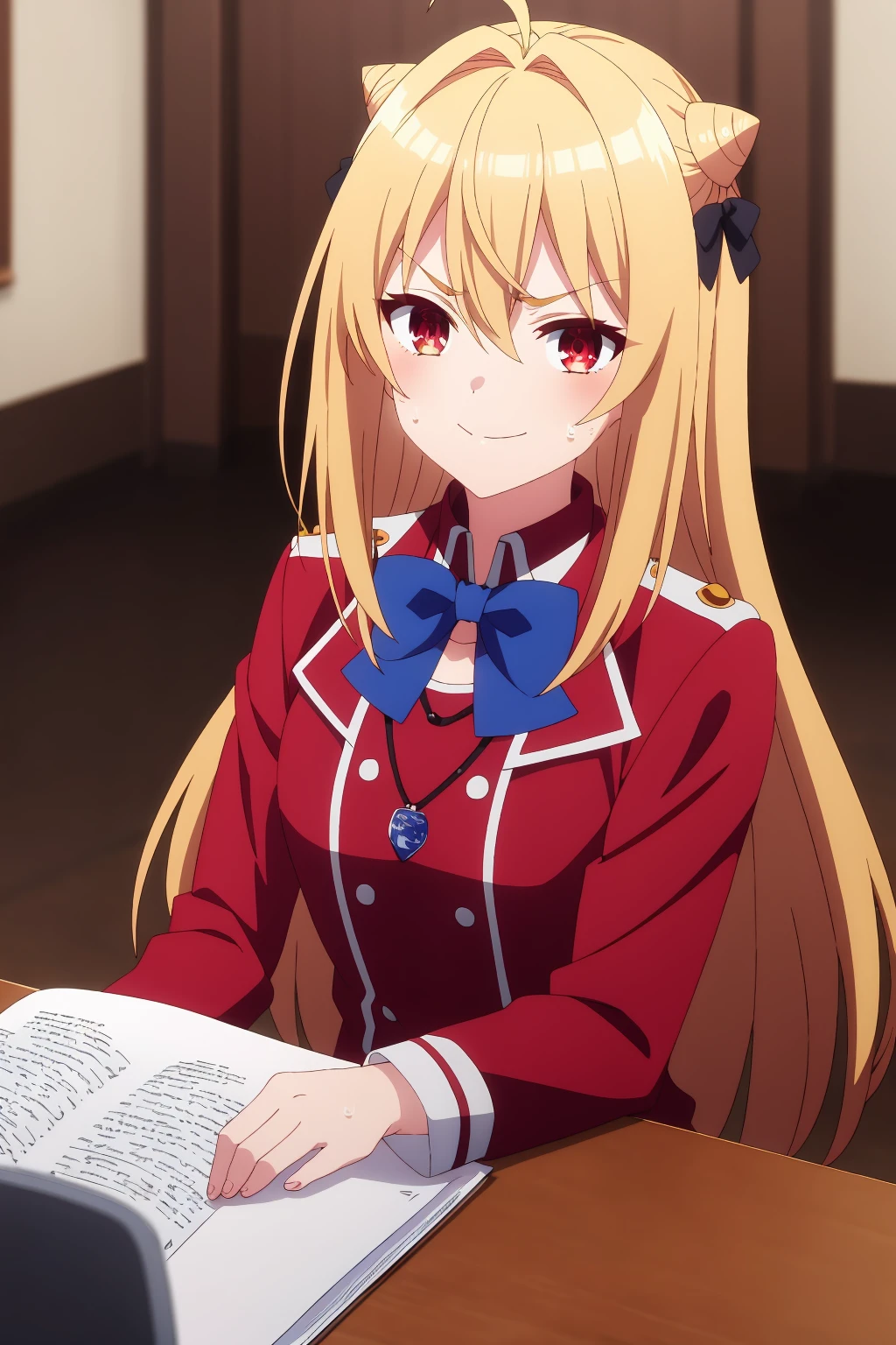 Terakomari, long hair, blonde hair, red eyes, ahoge, hair ribbon, hair bun, double bun, hair ornament, bangs