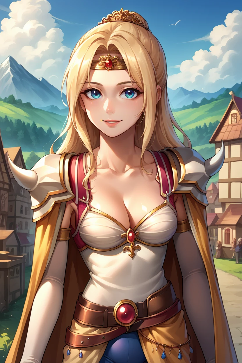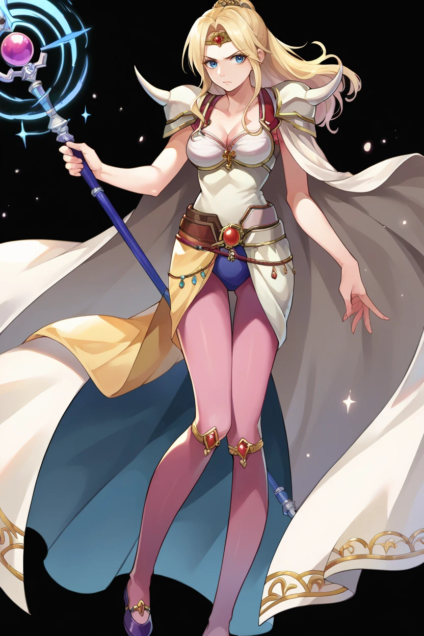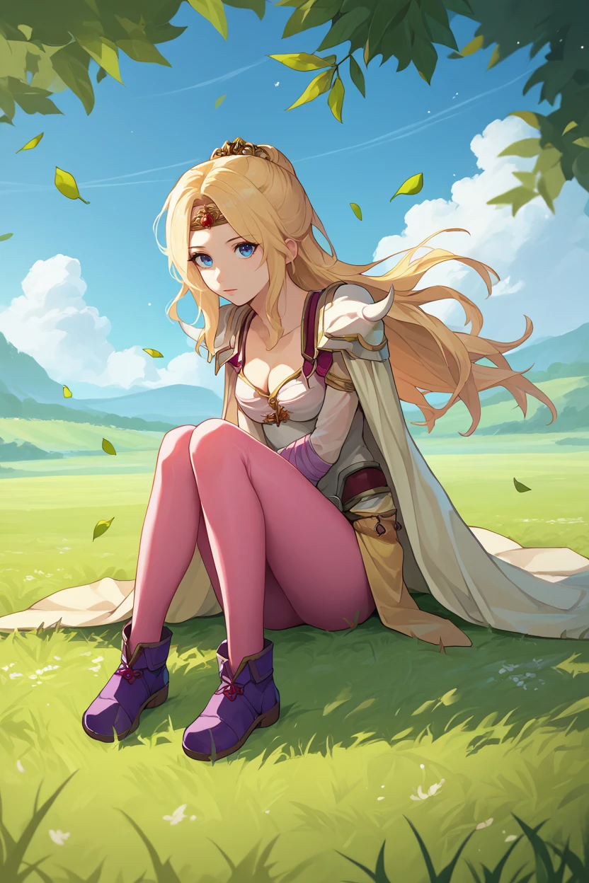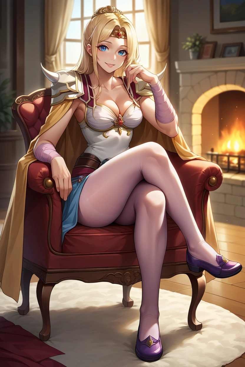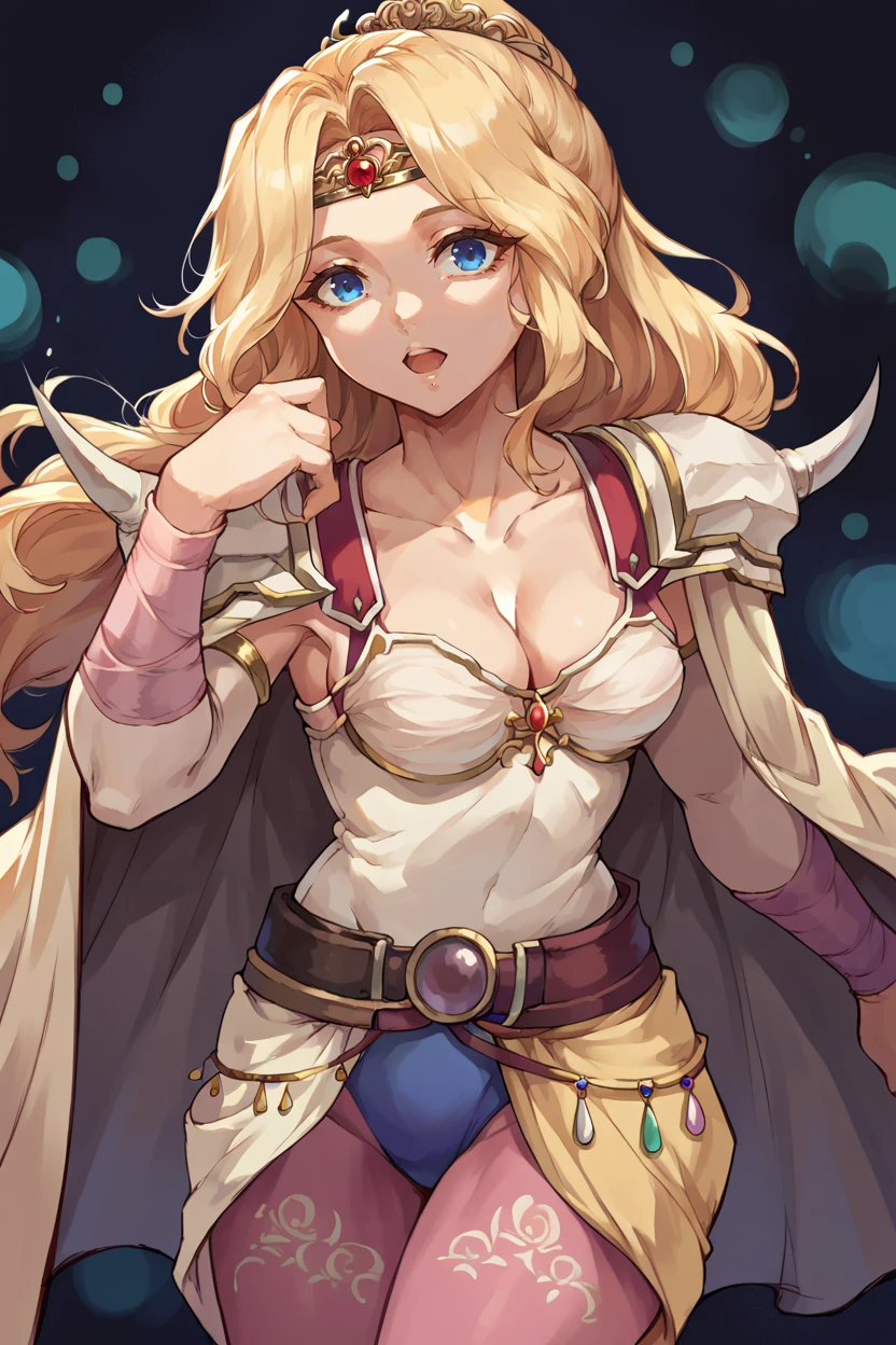 Add "circlet, cape, cleavage, shoulder armor, camisole, clothes around waist, pink pantyhose" for her typical look.