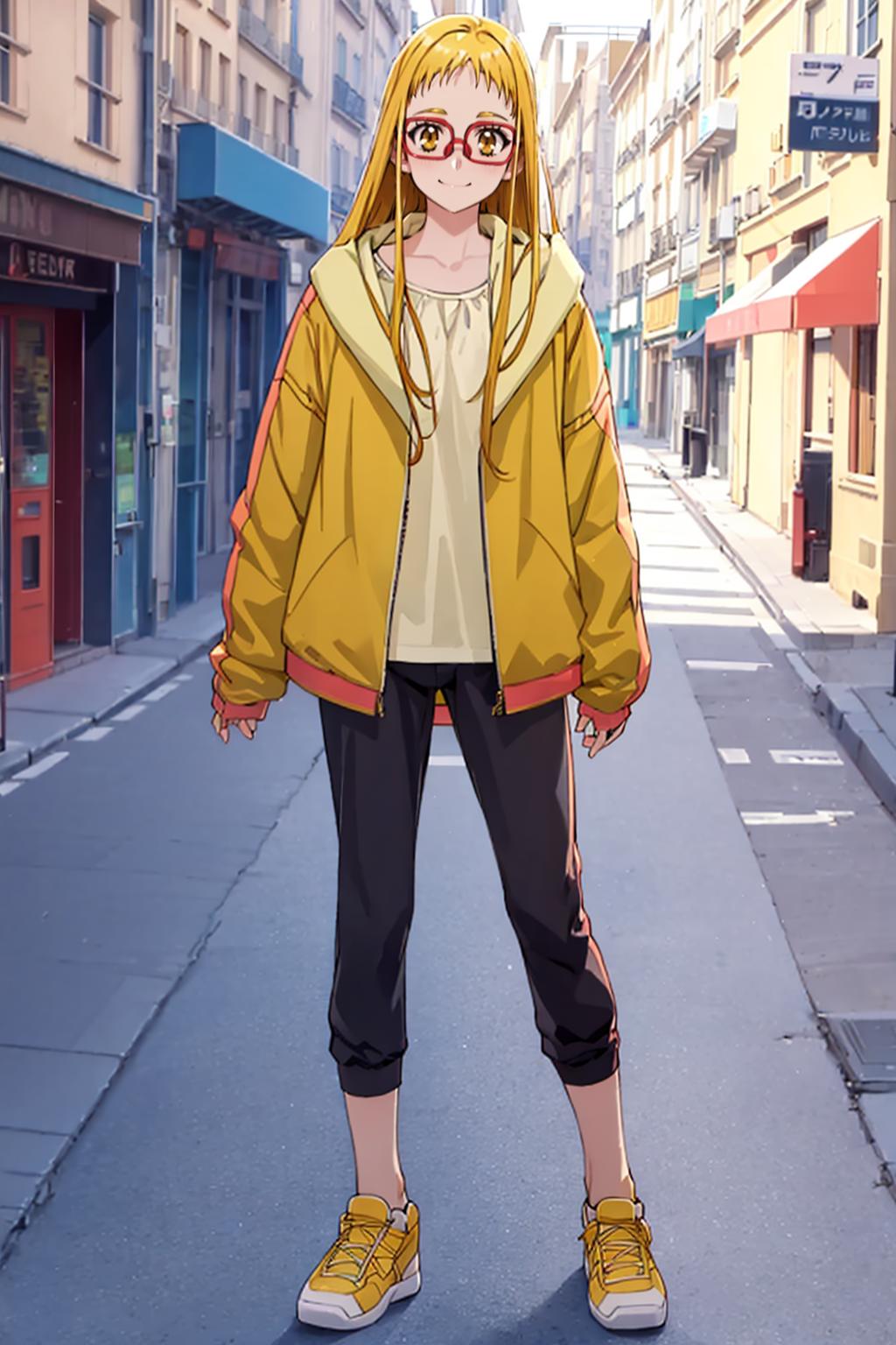 yellow jacket, yellow shirt, glasses, capri pants, yellow sneakers