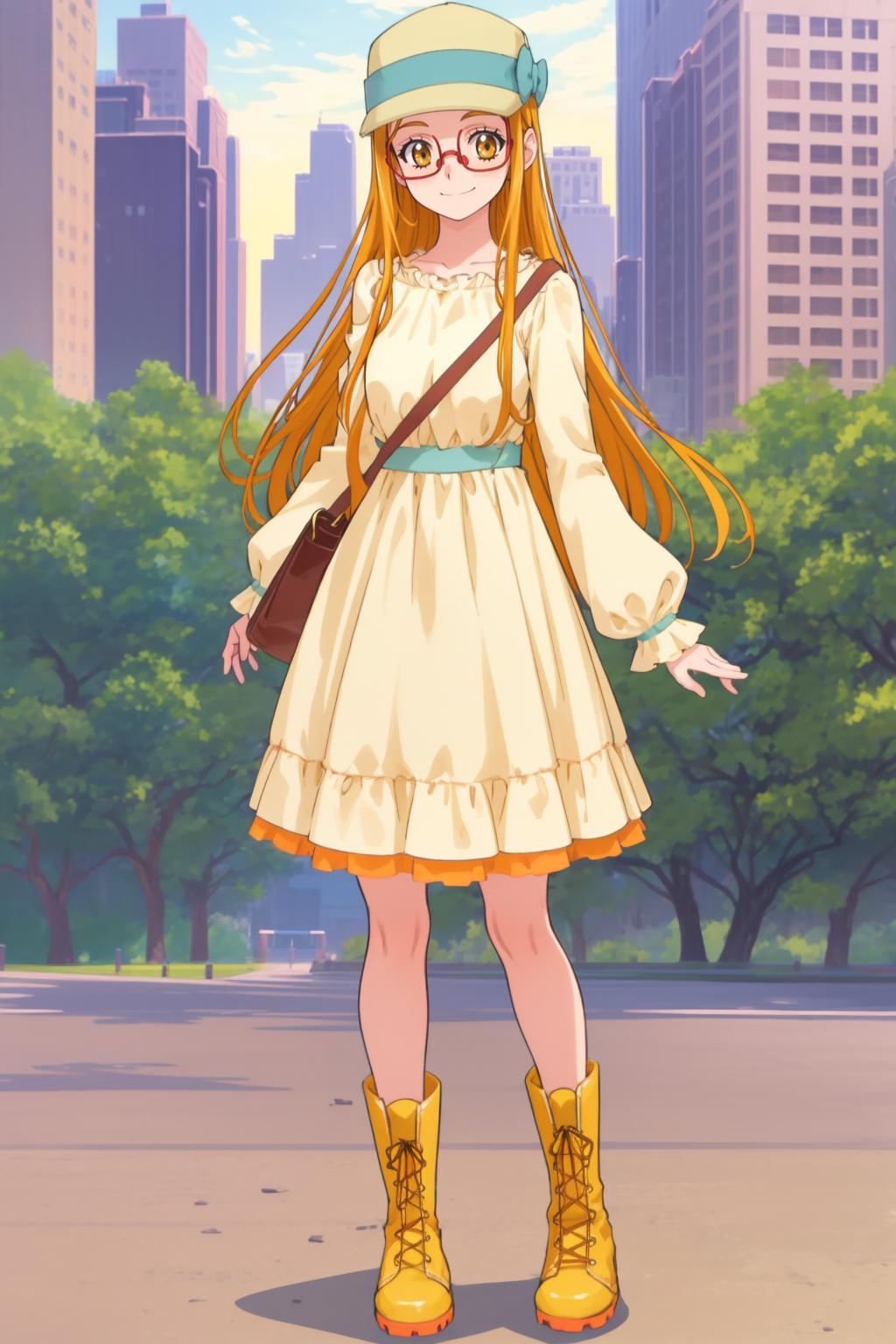 Outfit2: yellow hat, yellow dress, glasses, yellow boots