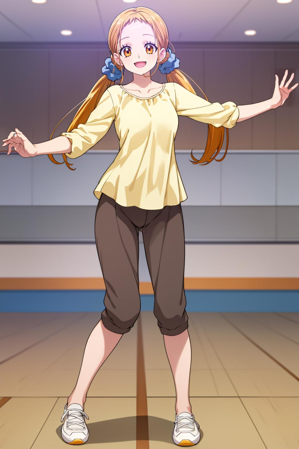 yellow shirt, blue scrunchie, capri pants, twintails, shoes