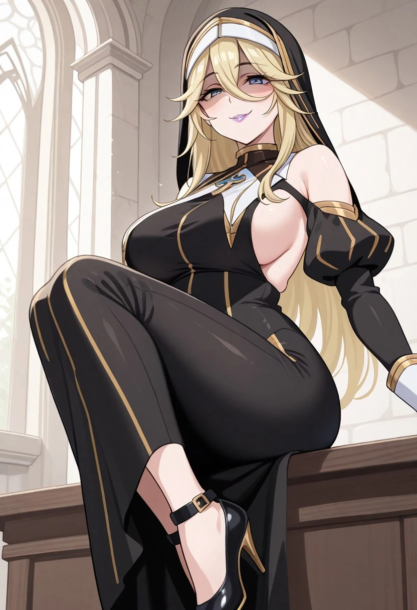 caldmellia, 1girl, solo, blonde hair, long hair, parted lips, purple lips, large breasts, hair between eyes, blue eyes, bangs, nun, detached sleeves, bare shoulders, collarbone, black dress, detached sleeves, sideboob, puffy sleeves, high heels, gloves, black footwear, smile, shaded face, evil eyes, evil smile,