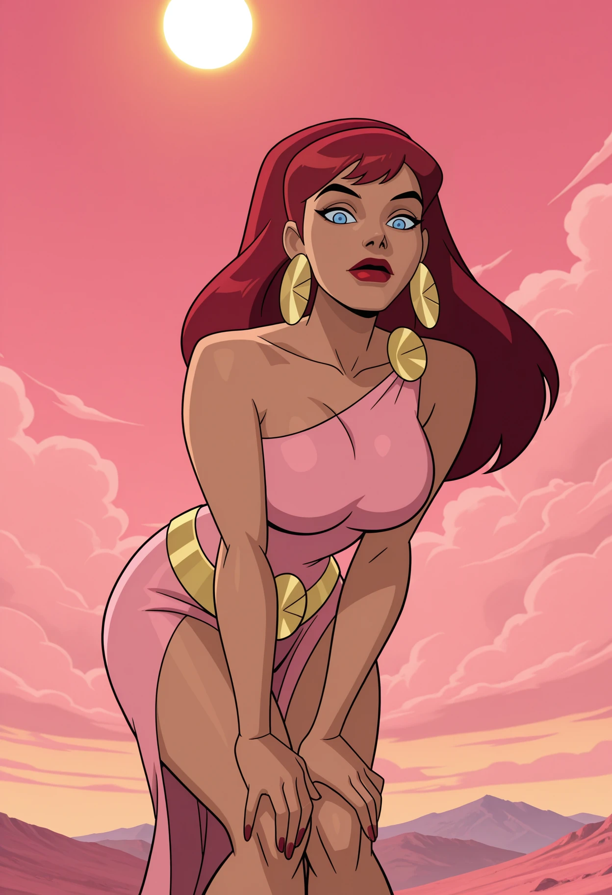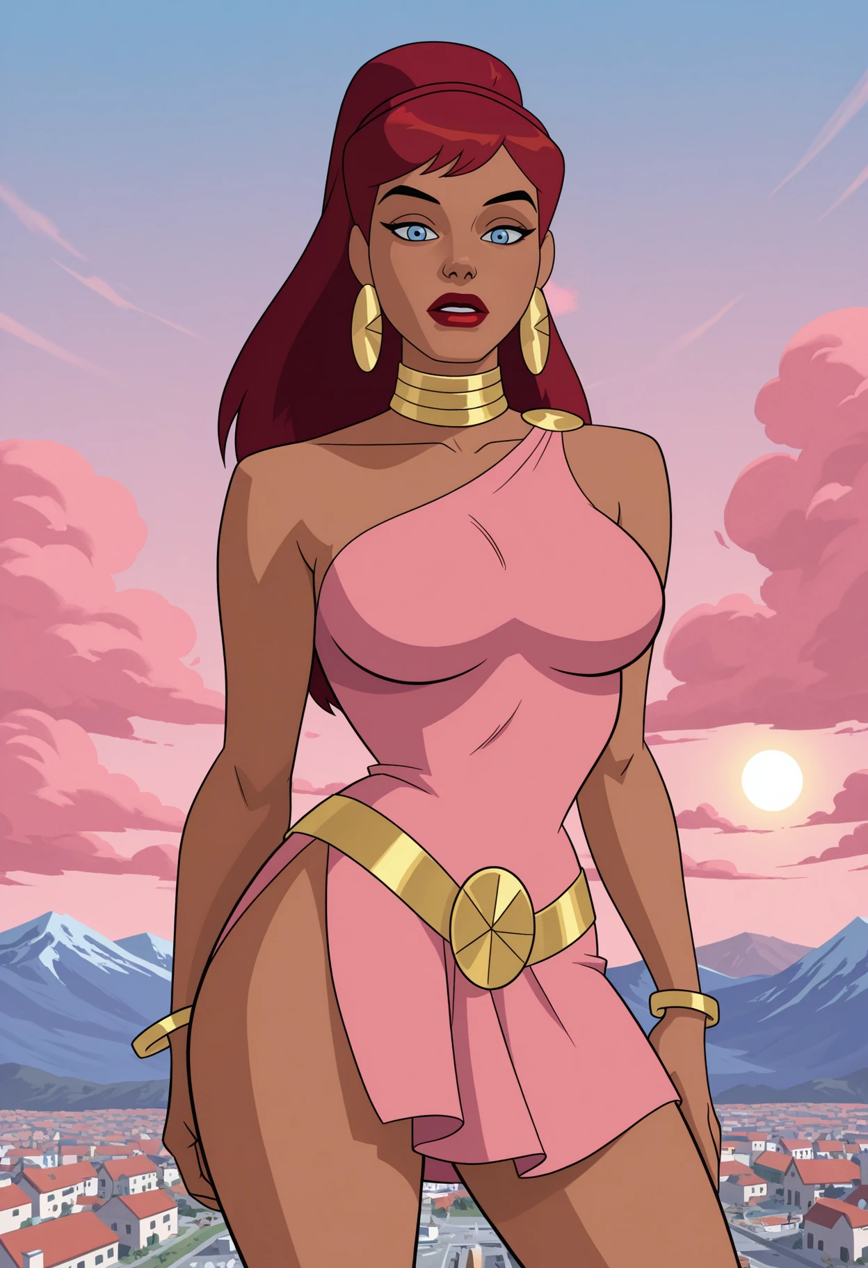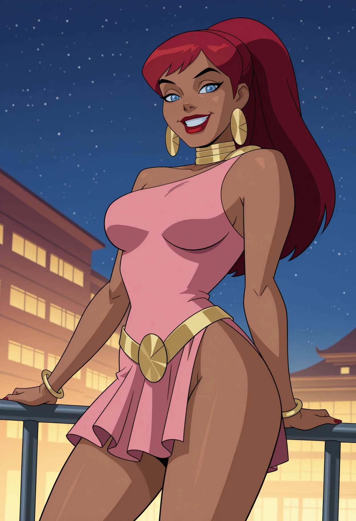 choker, jewelry, neck ring, earrings, hoop earrings, bracelet, bare shoulders, collarbone, dress, pink dress, short dress, single strap, cleavage, thighs, belt,