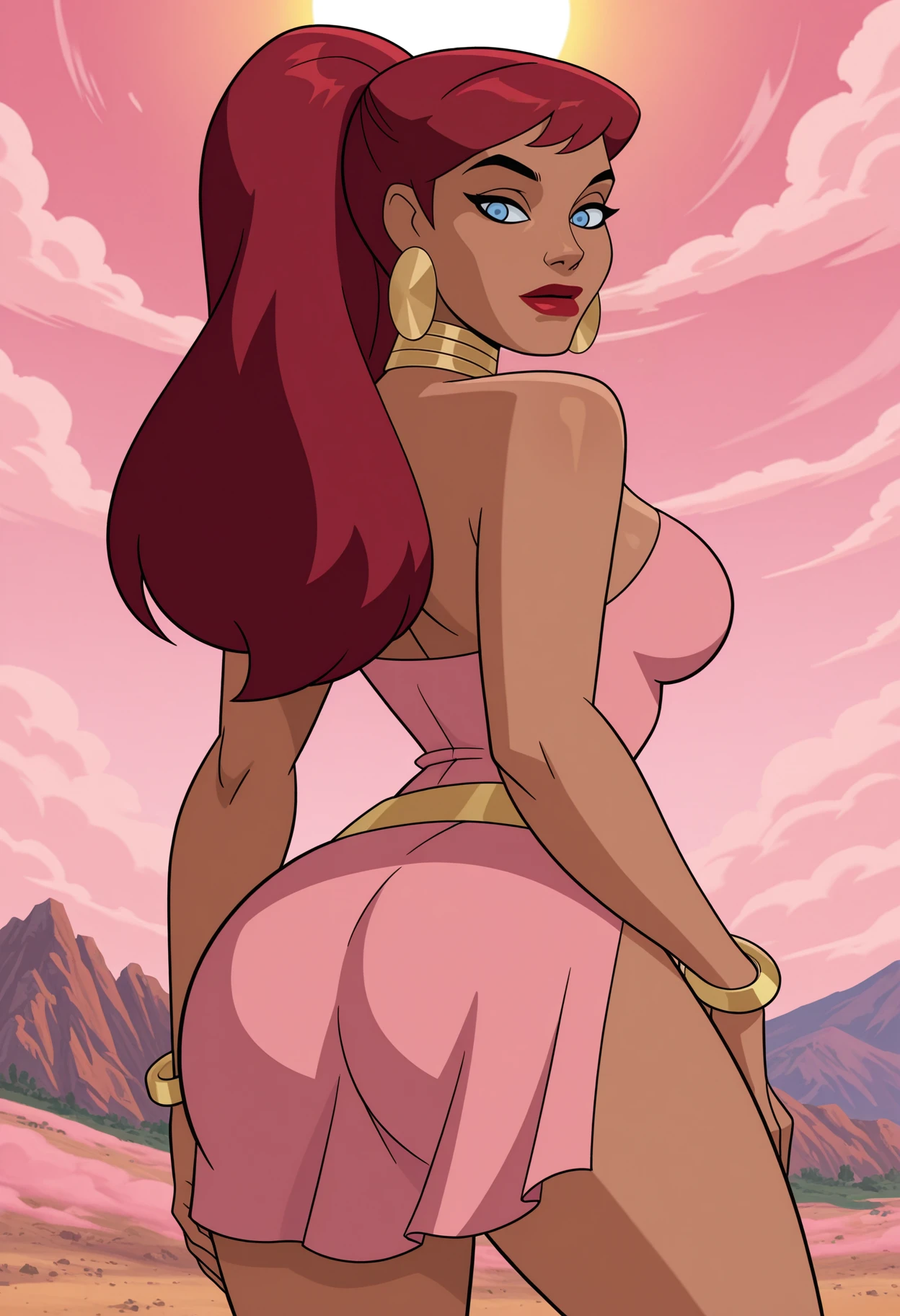 choker, jewelry, neck ring, earrings, hoop earrings, bracelet, bare shoulders, collarbone, dress, pink dress, short dress, single strap, cleavage, thighs, belt,You can support my work by following the link: https://boosty.to/nmackelie