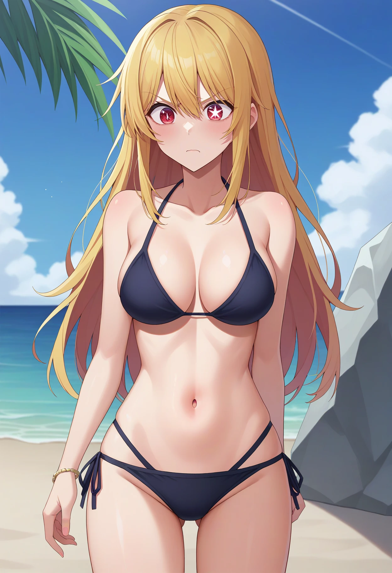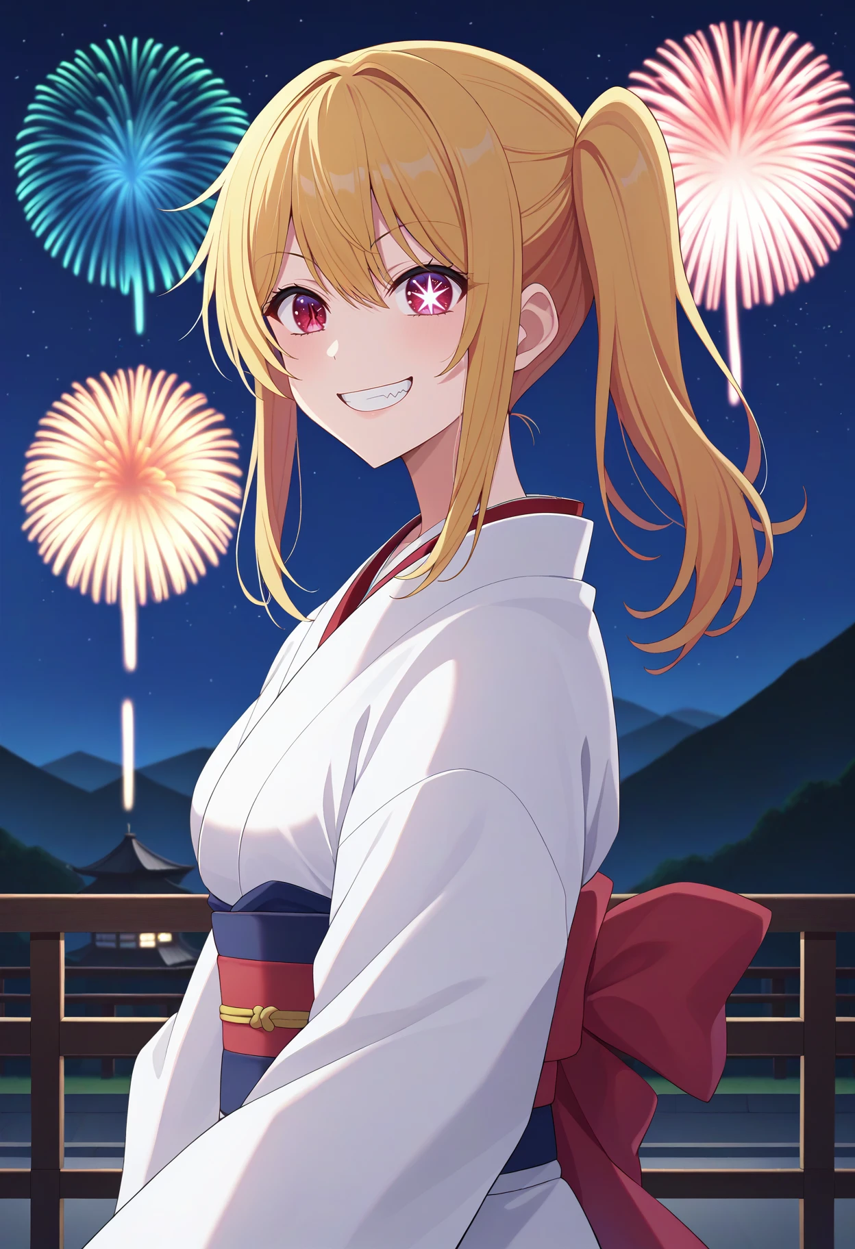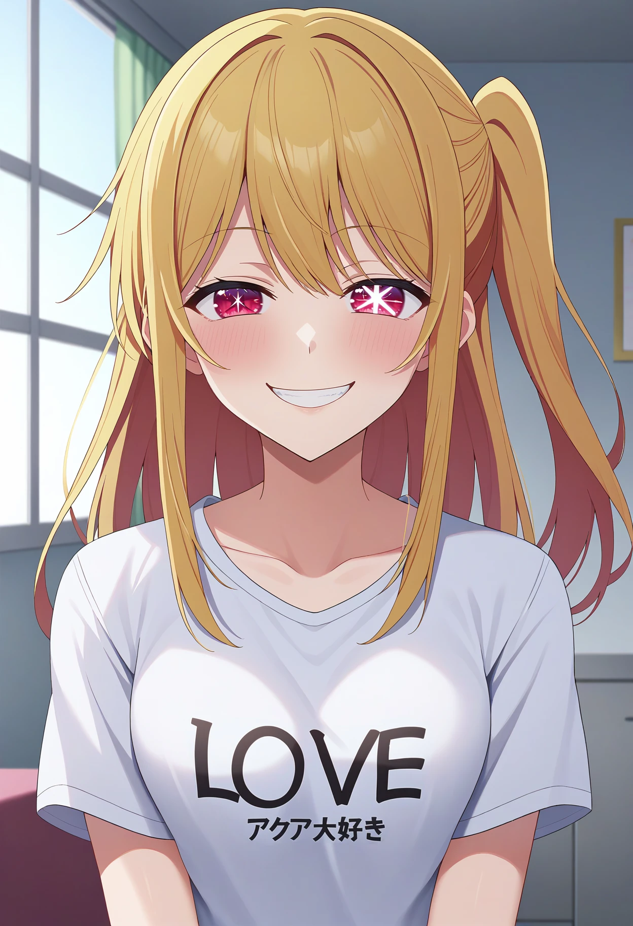 hoshino ruby, blonde hair, long hair, one side up, red eyes, mismatched pupils, star-shaped pupilsSD 1.5