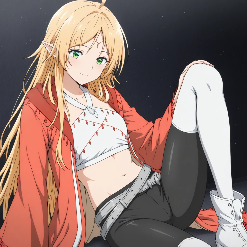Clothing: (red jacket, white halter top, gray belts, navel, midriff, black biker pants, white thighhighs, white boots)