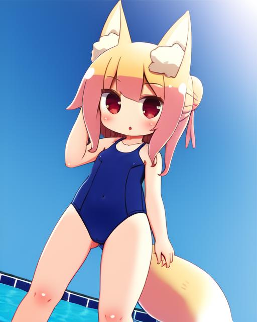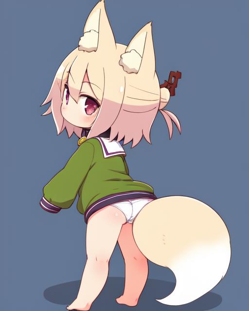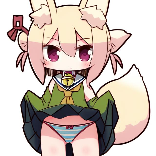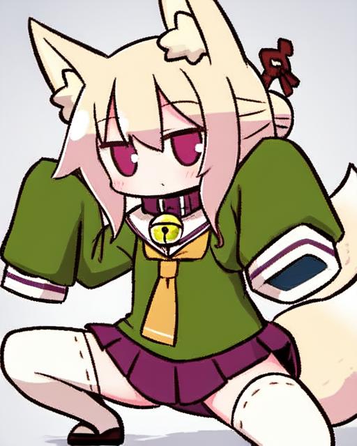 tail, skirt, sleeves past fingers, sleeves past wrists, thighhighs, green shirt, shirt, purple skirt, bangs, pleated skirt, orange necktie, ribbon-trimmed legwear, white thighhighs, neck bell, long sleeves, collar, flat chest, brown collar, hair between eyes, necktie, blush, blonde hair, ribbon trim, sparkle, closed mouth, sailor collar