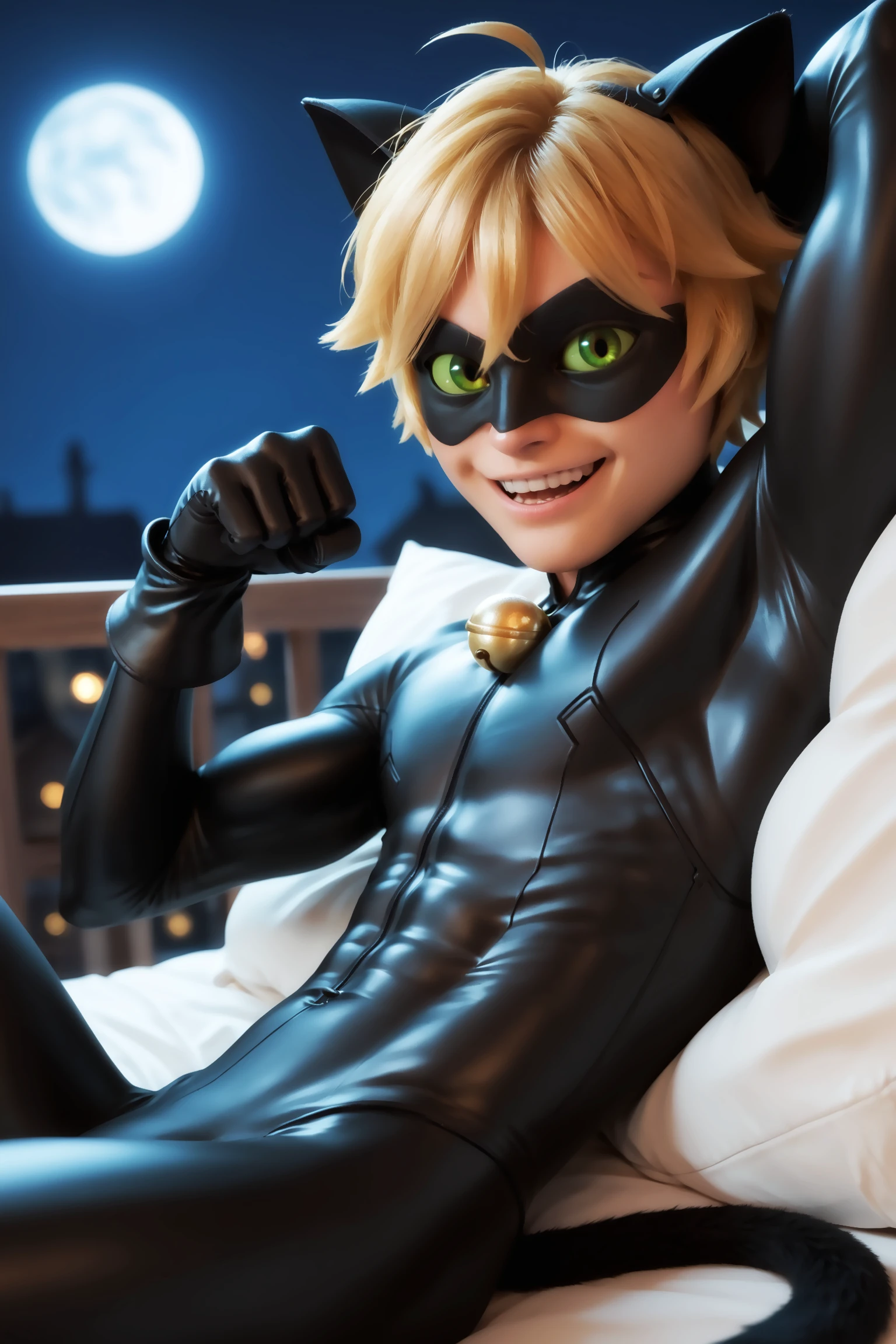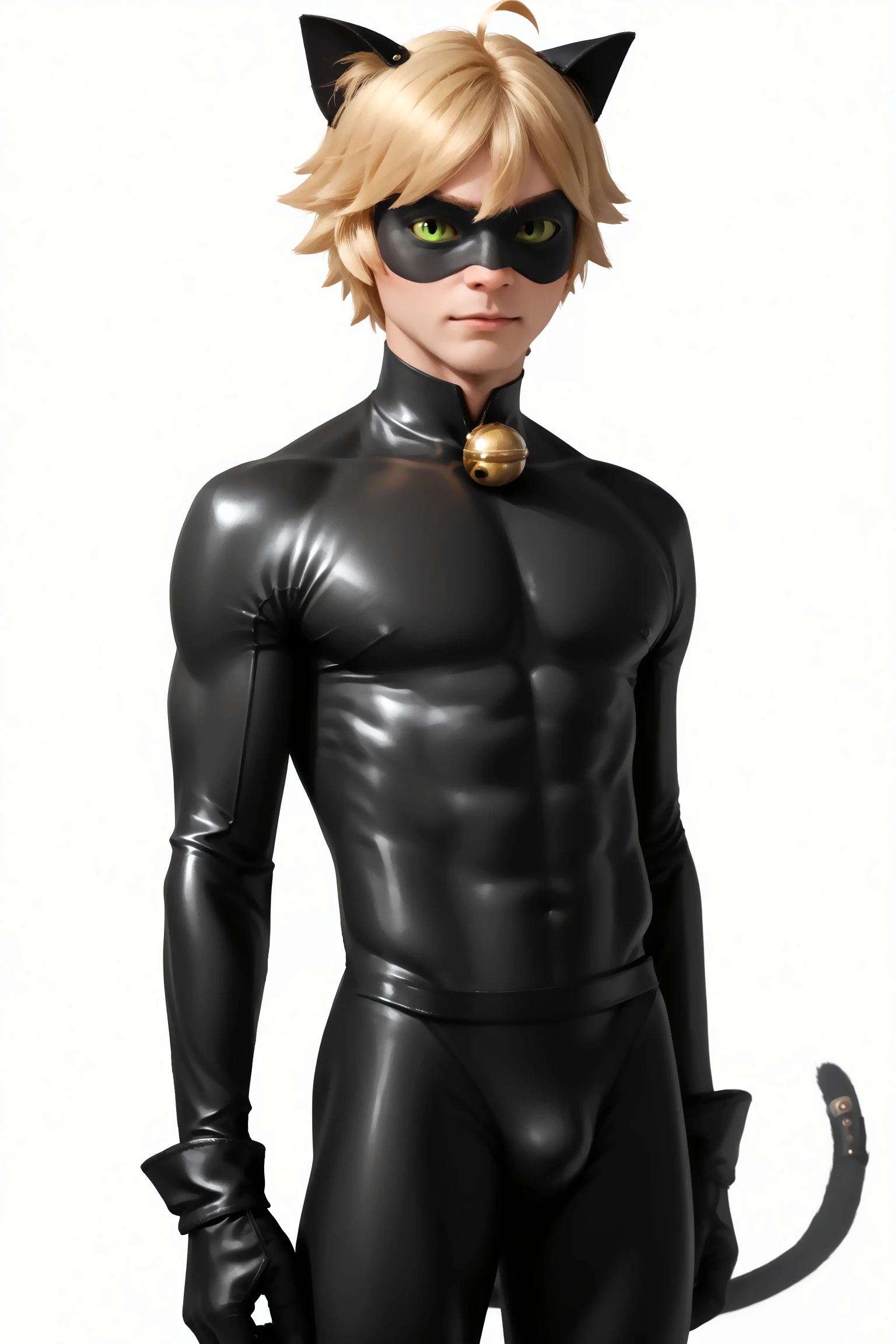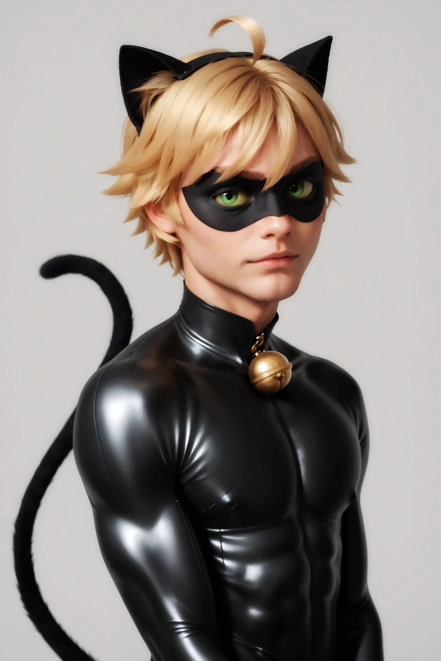 Trigger : imtdchatnoir, 1boy, male, blonde hair, animal ears, mask, cat ears, cat boy, bodysuit, bell, green sclera, green eyes, black bodysuit, domino mask, tail, cat tail, fake animal ears, ahoge, skin tight