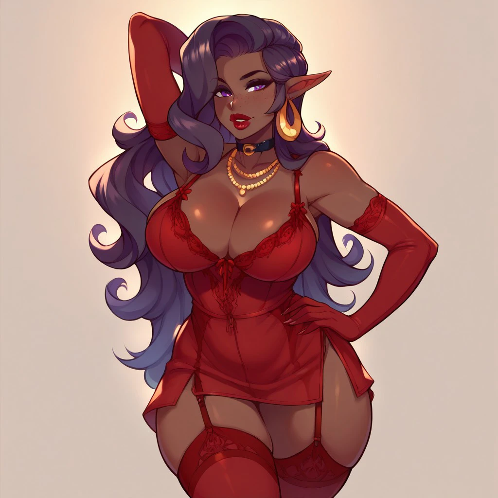 vanessa, dark skin, pointy ears, jewelry, long purple hair, purple eyes, red lips