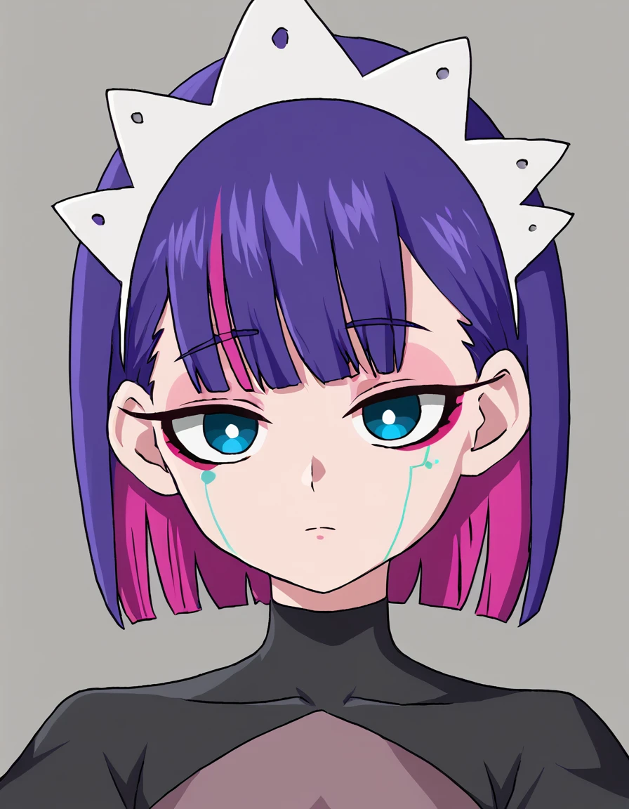 nirachan, 1girl, solo, multicolored hair, purple hair, maid headdress, short hair, colored inner hair, blue eyes, maid, blunt bangs, android
