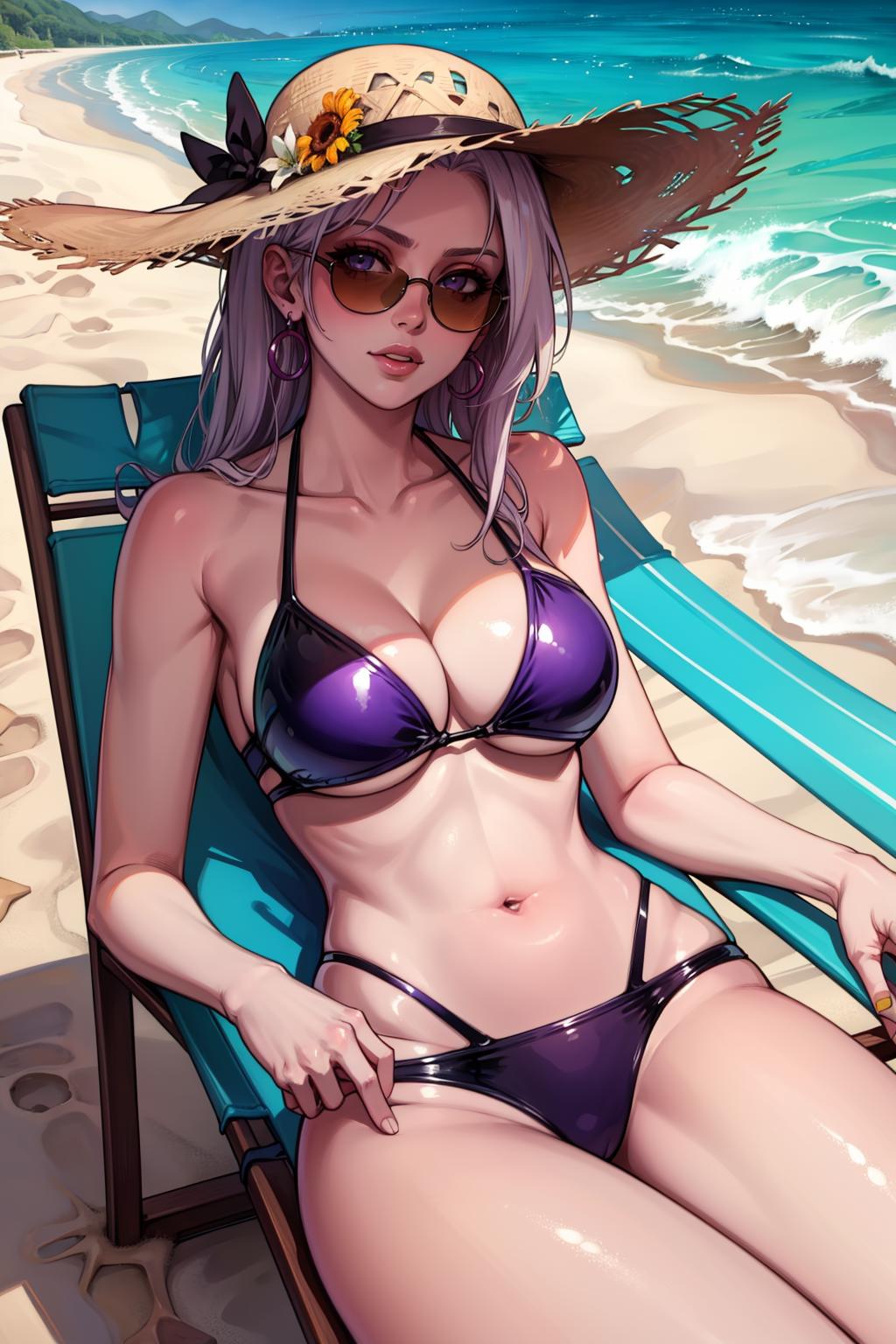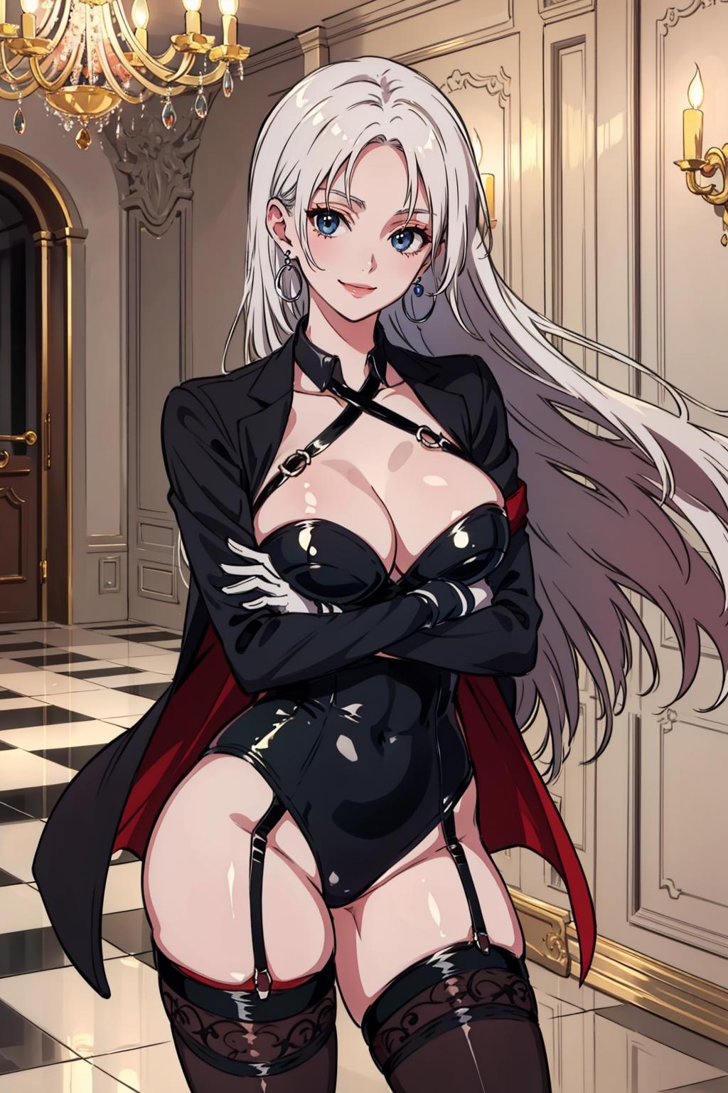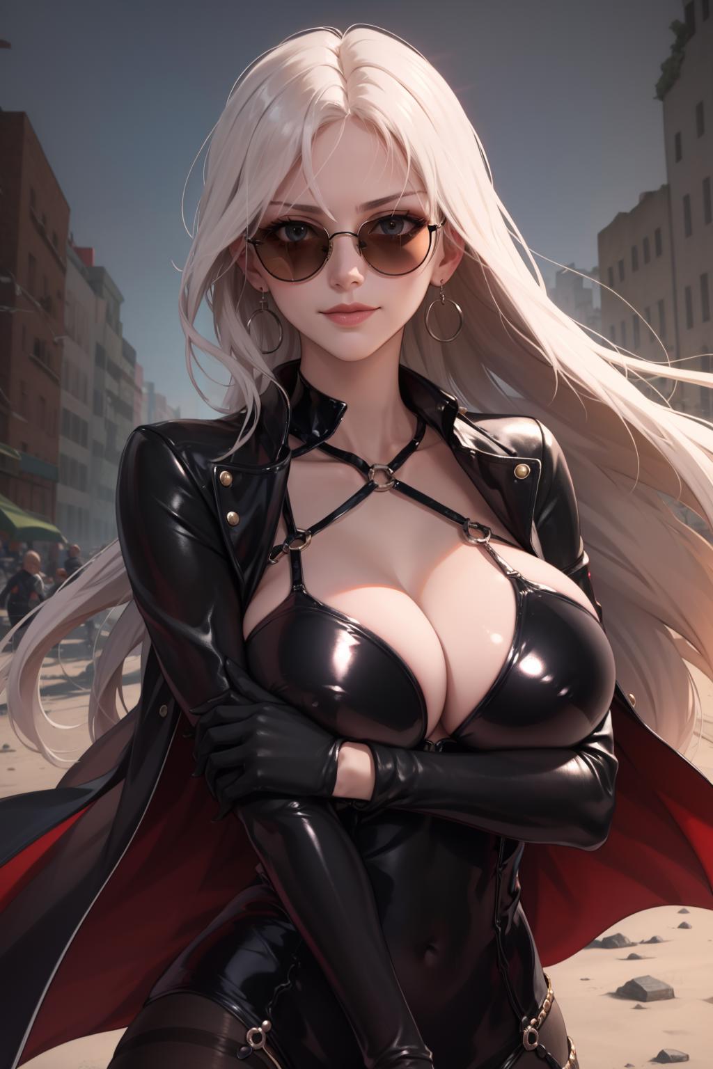 Add "earrings, cleavage, black jacket, black leotard, thighhighs, garter straps, black gloves, sunglasses" for her typical look.