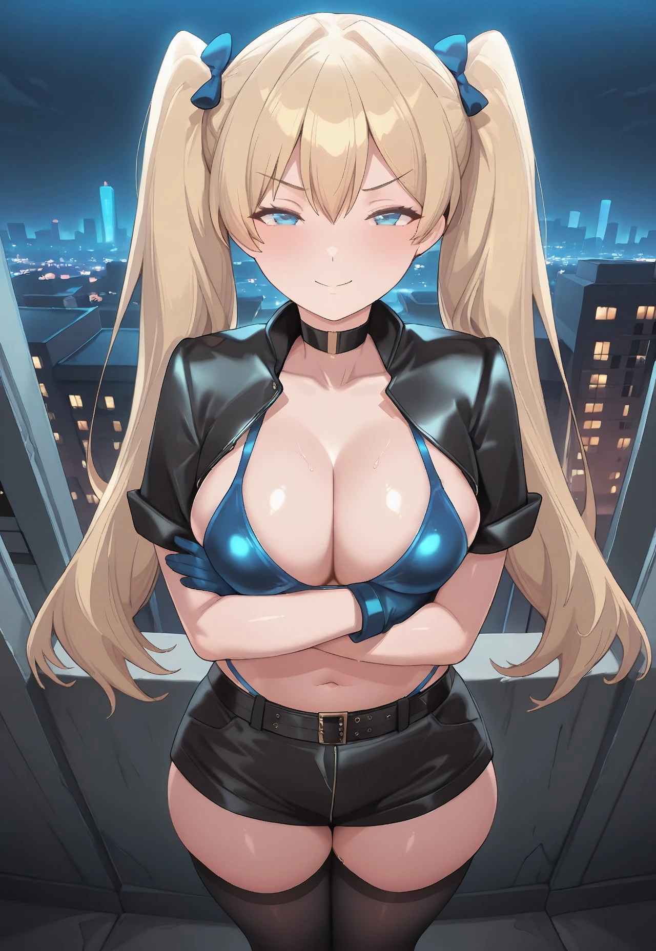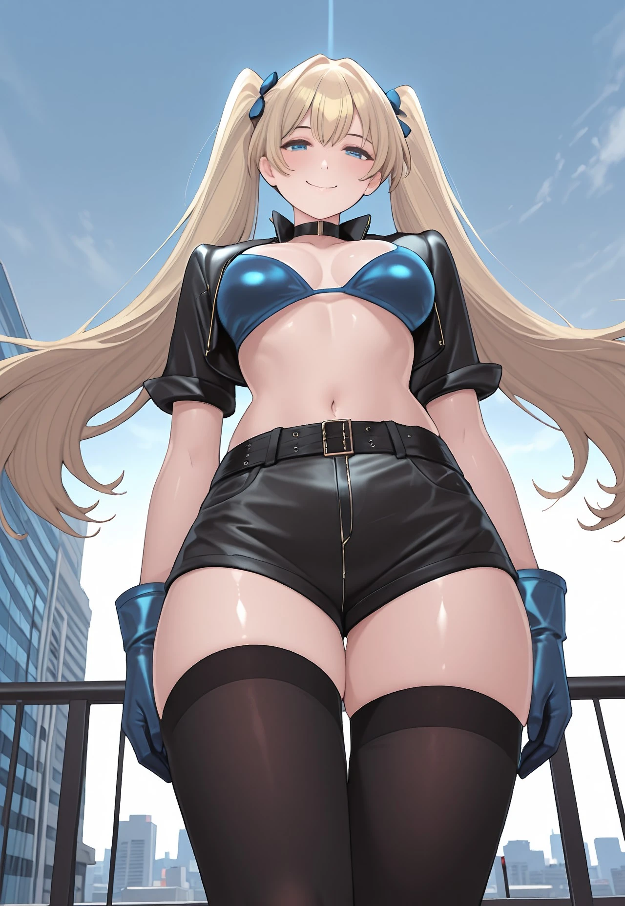 open_short_jacket, blue_bikini_top, black_shorts, black_thighhighs, blue_gloves, belt, blue_thong, black_choker,