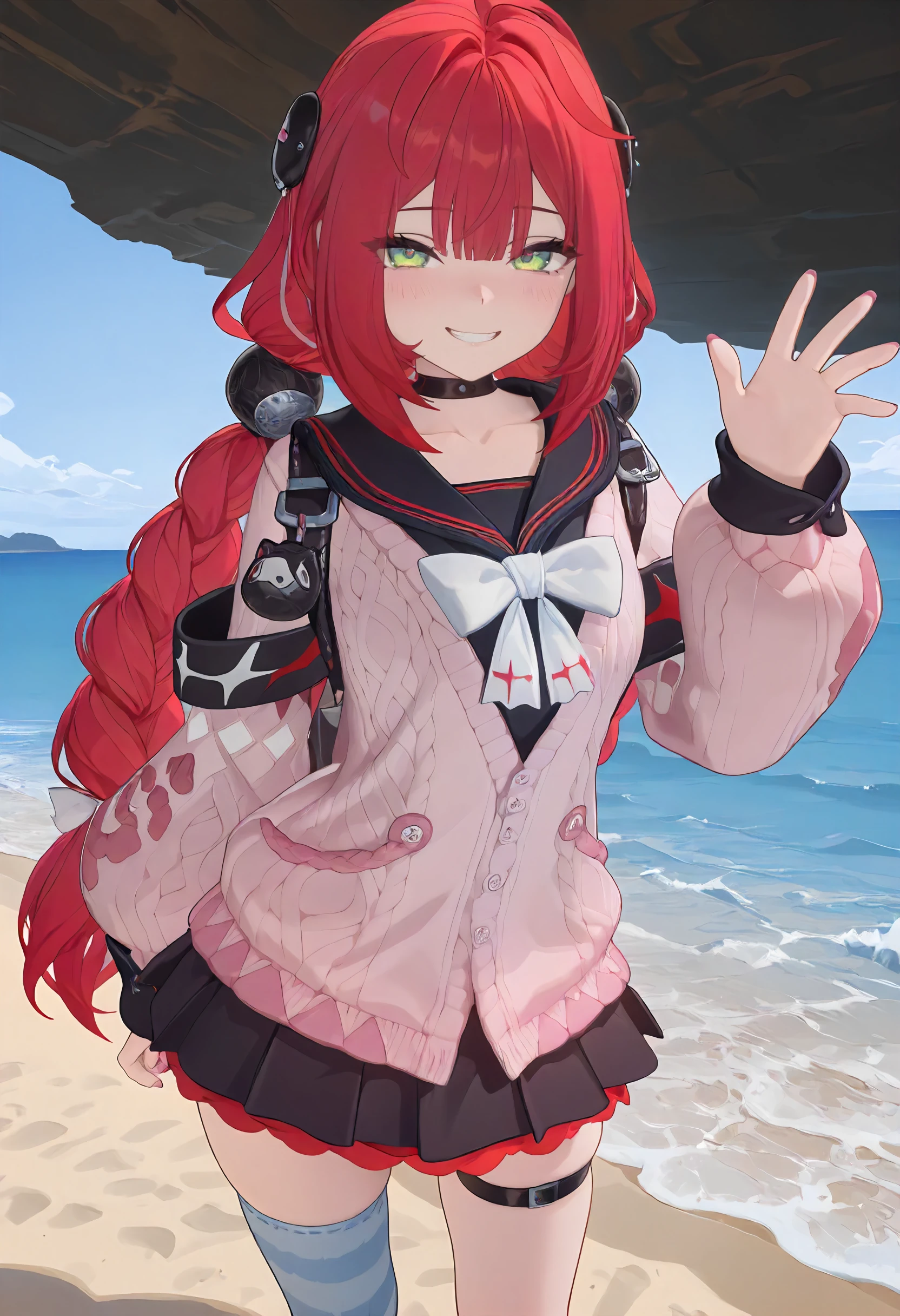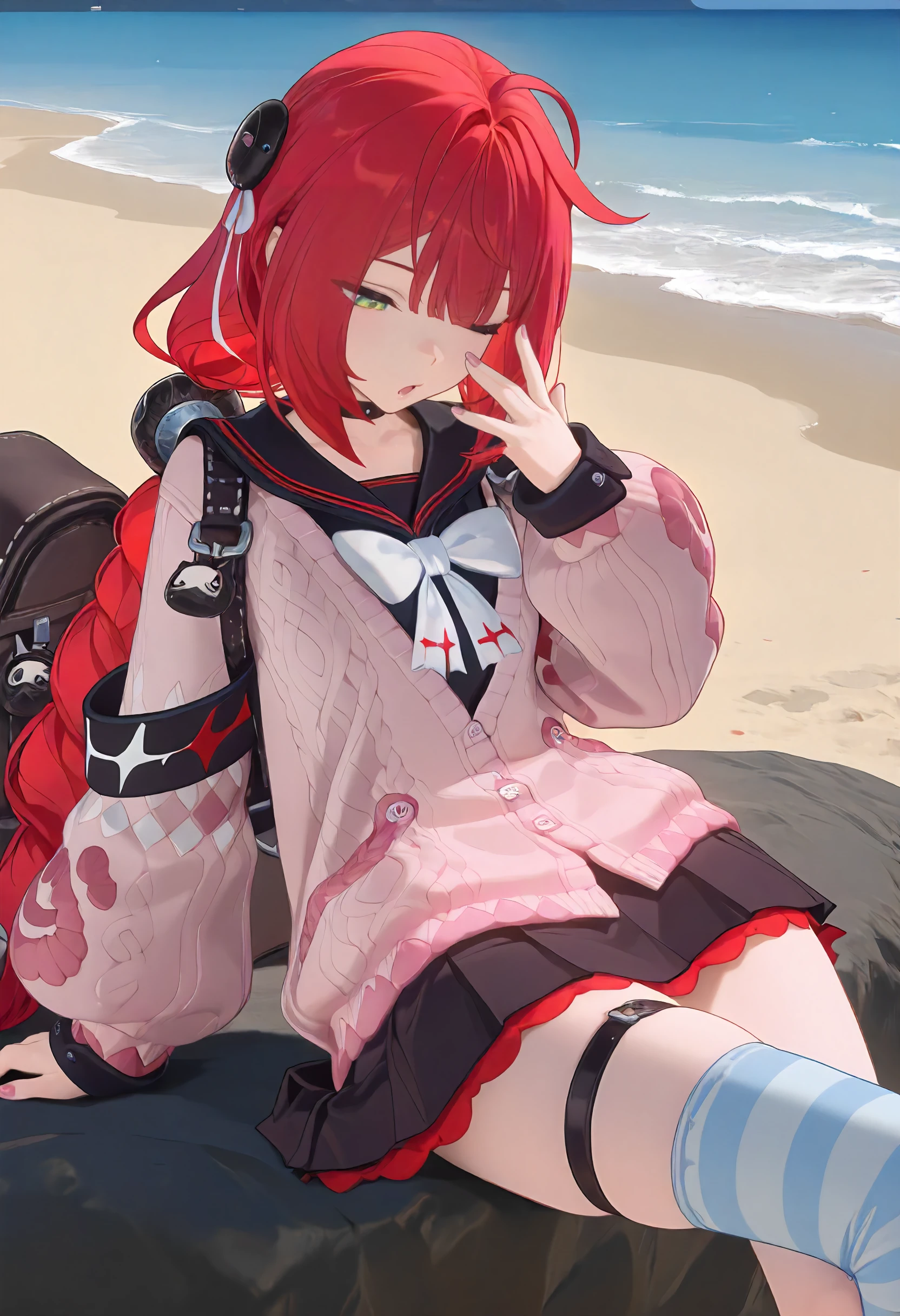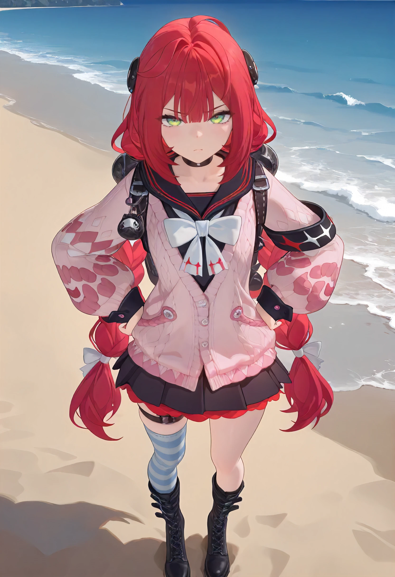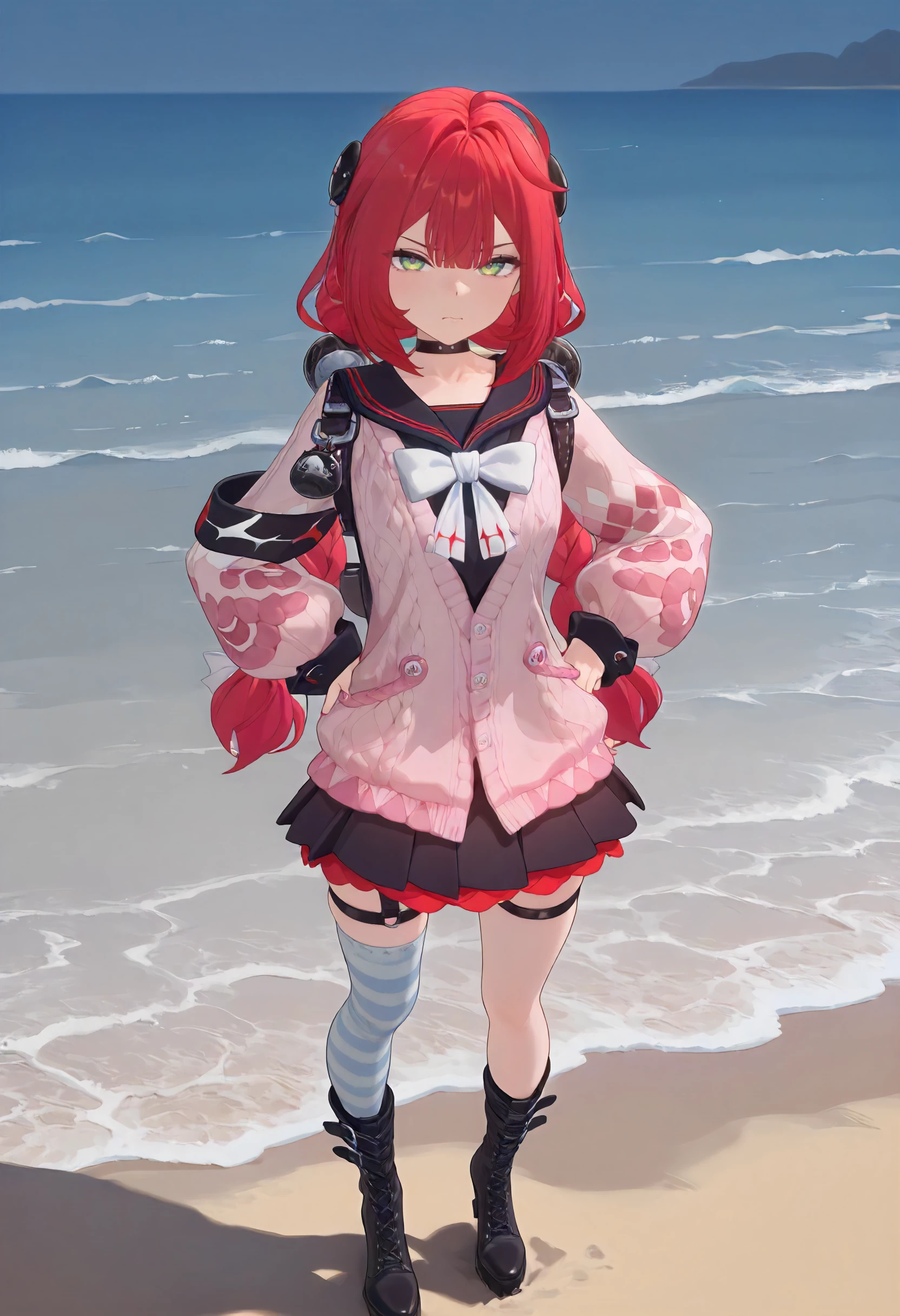 choker, black and red sailor collar, backpack, pink knitted sweater, white ribbon, black armband, pink nails, black and red skirt, thigh strap, asymmetrical thigh highs, blue stiped thigh highs, black boots,
