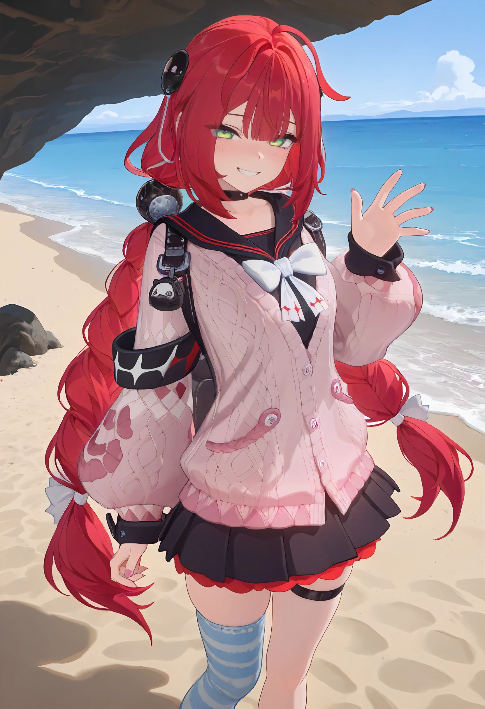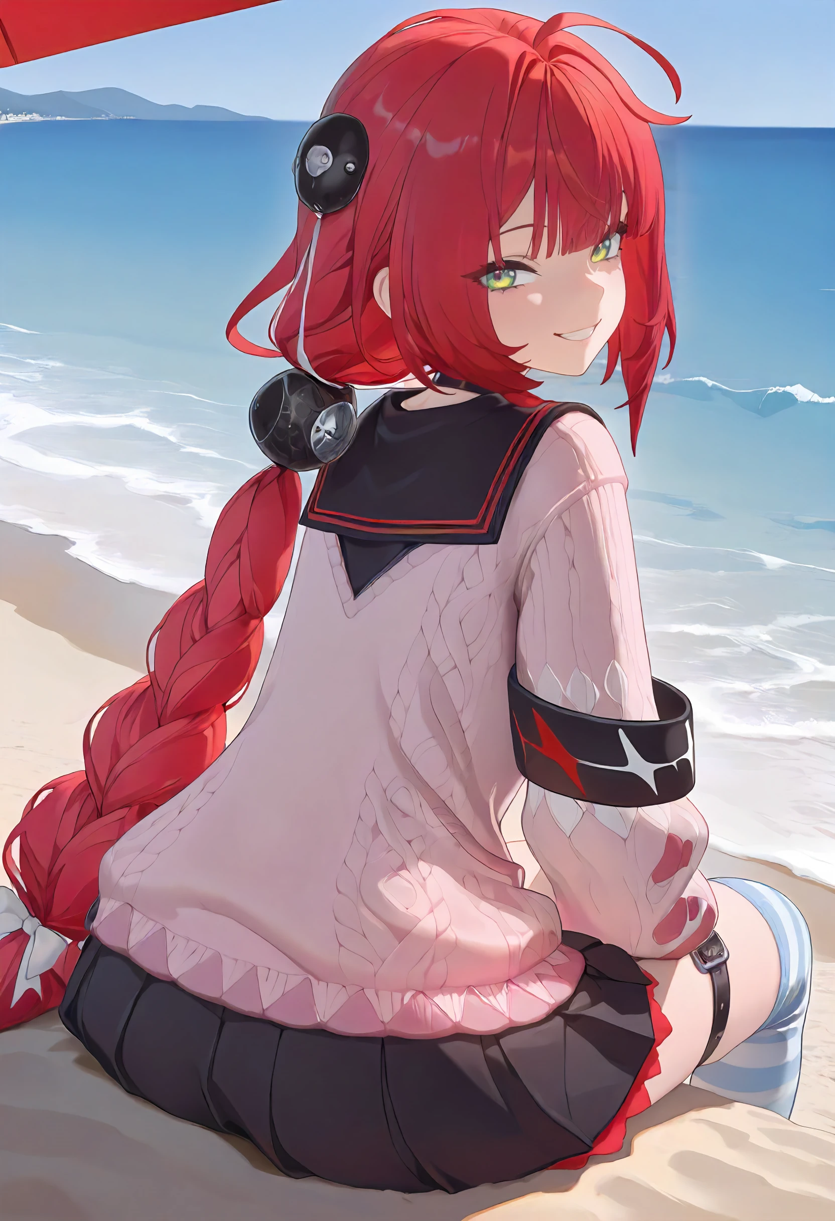 1girl, Yuzuha, red hair, ahoge, bangs, twin braids, hair ornaments, green eyes, eyebrows,