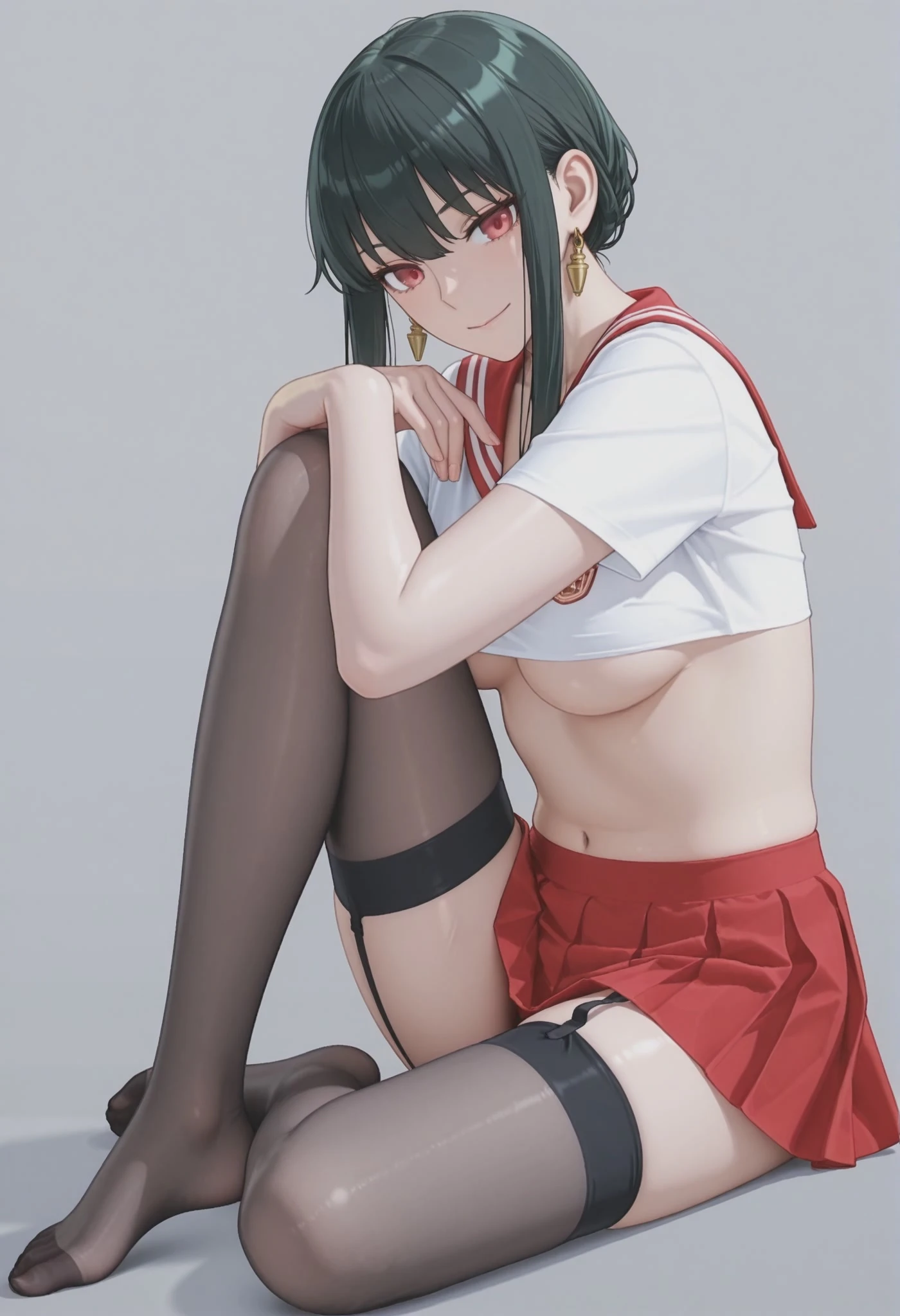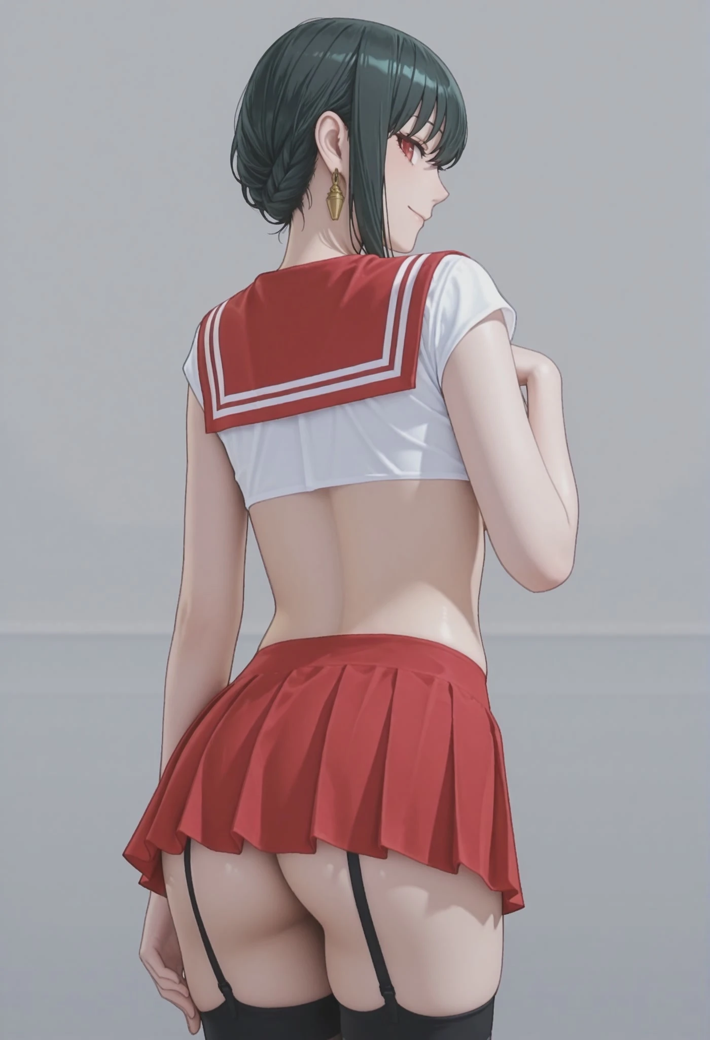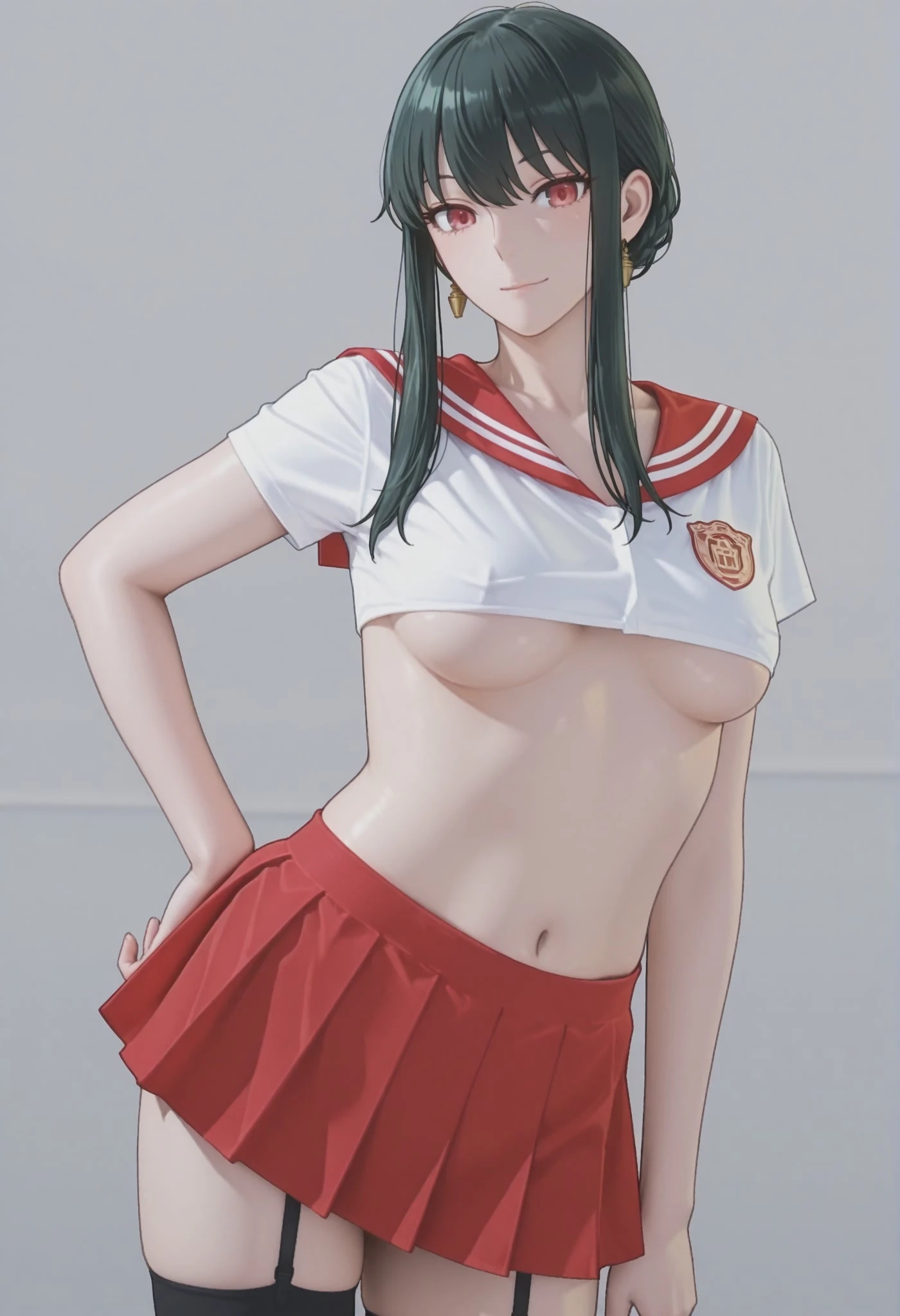 redsailorda, red sailor collar, white shirt, pleated skirt, red skirt, taut clothes, underboob, midriff, navel, crop top