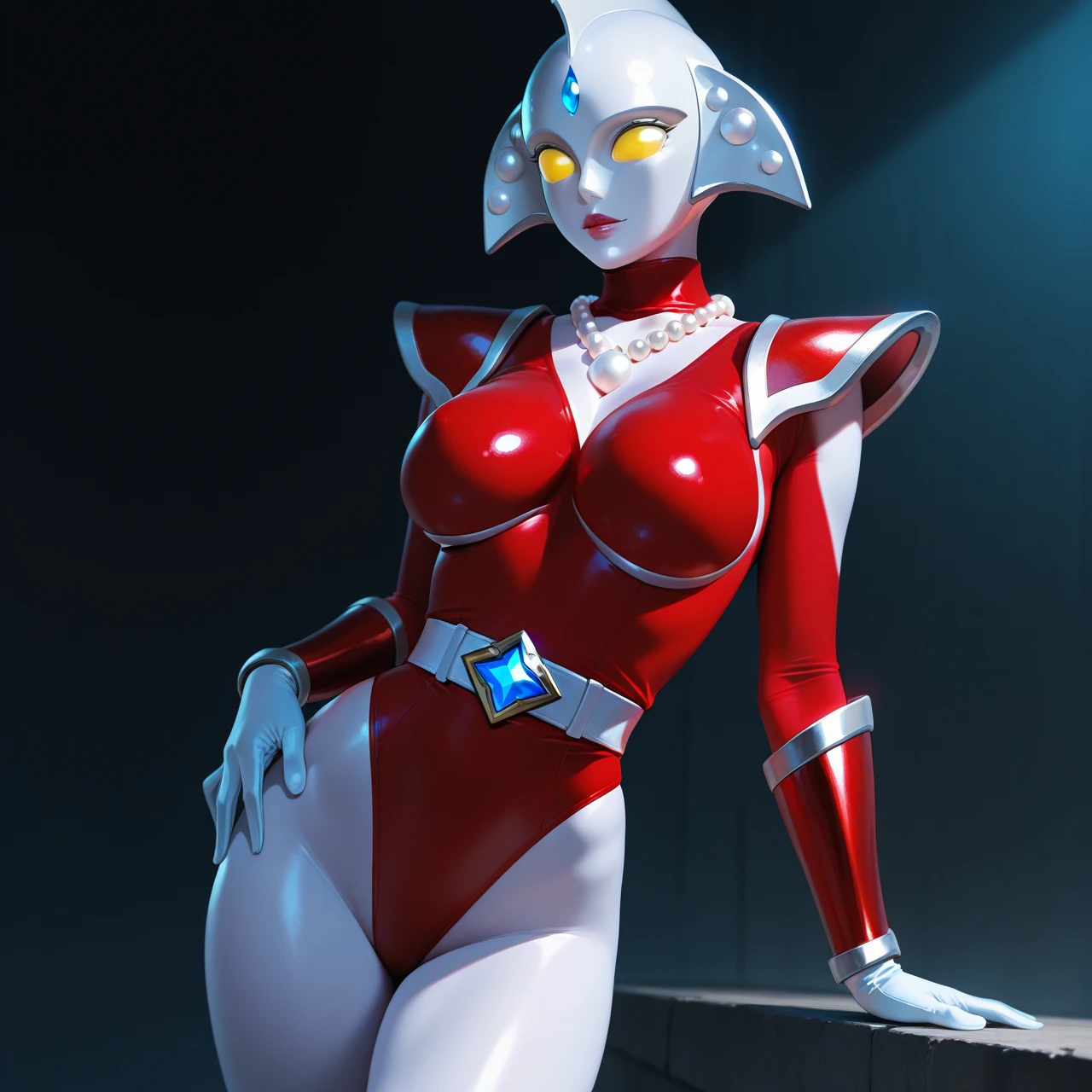 prompt:,1girl, solo, white skin, xbethx, colored skin, headgear, red knee boots, white gloves, tokusatsu, alien, forehead jewel, medium breasts, shoulder pads, red leotard, yellow eyes, no pupils, silver necklace, blue buckle, white belt,, red bracer, pearl necklace