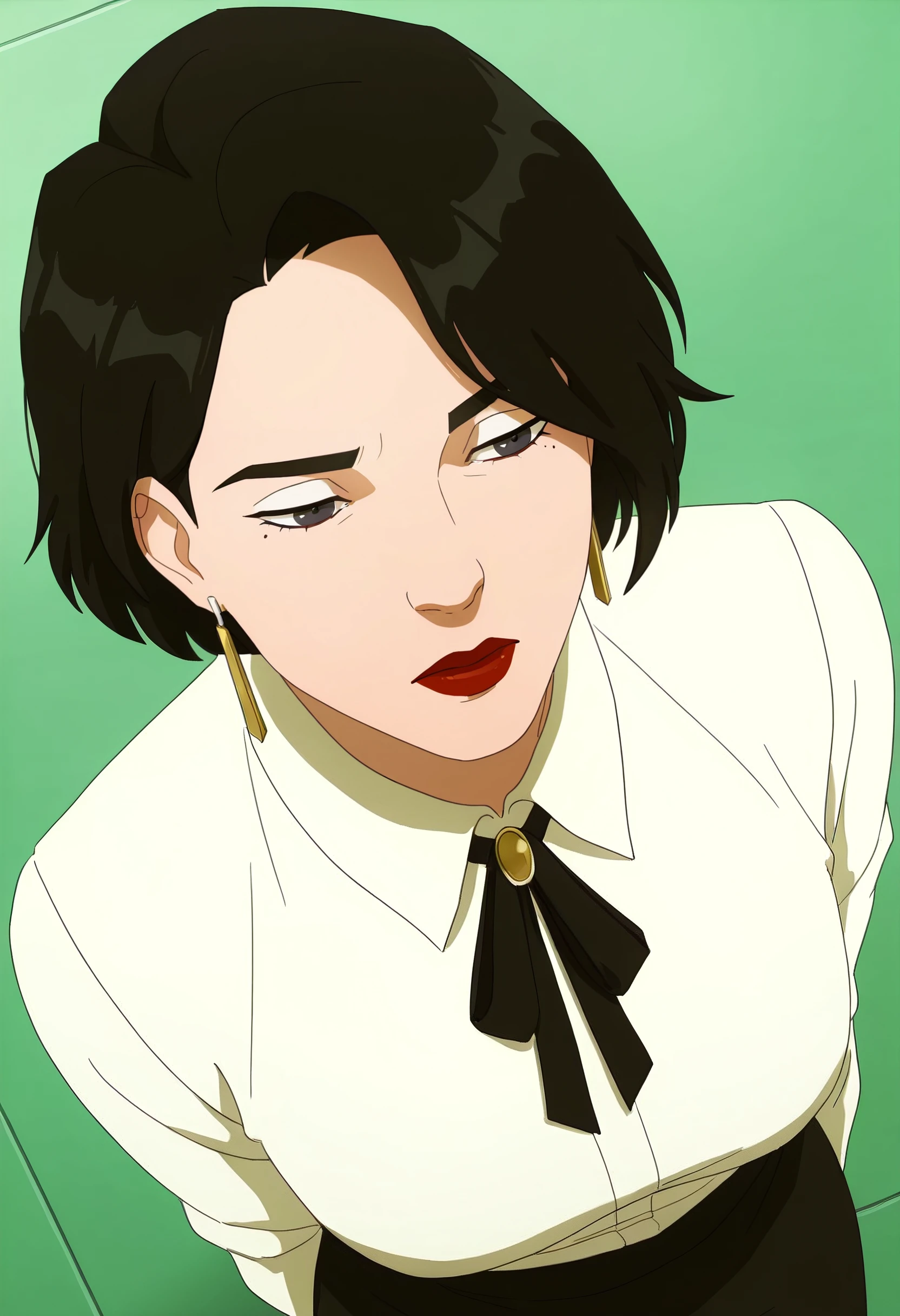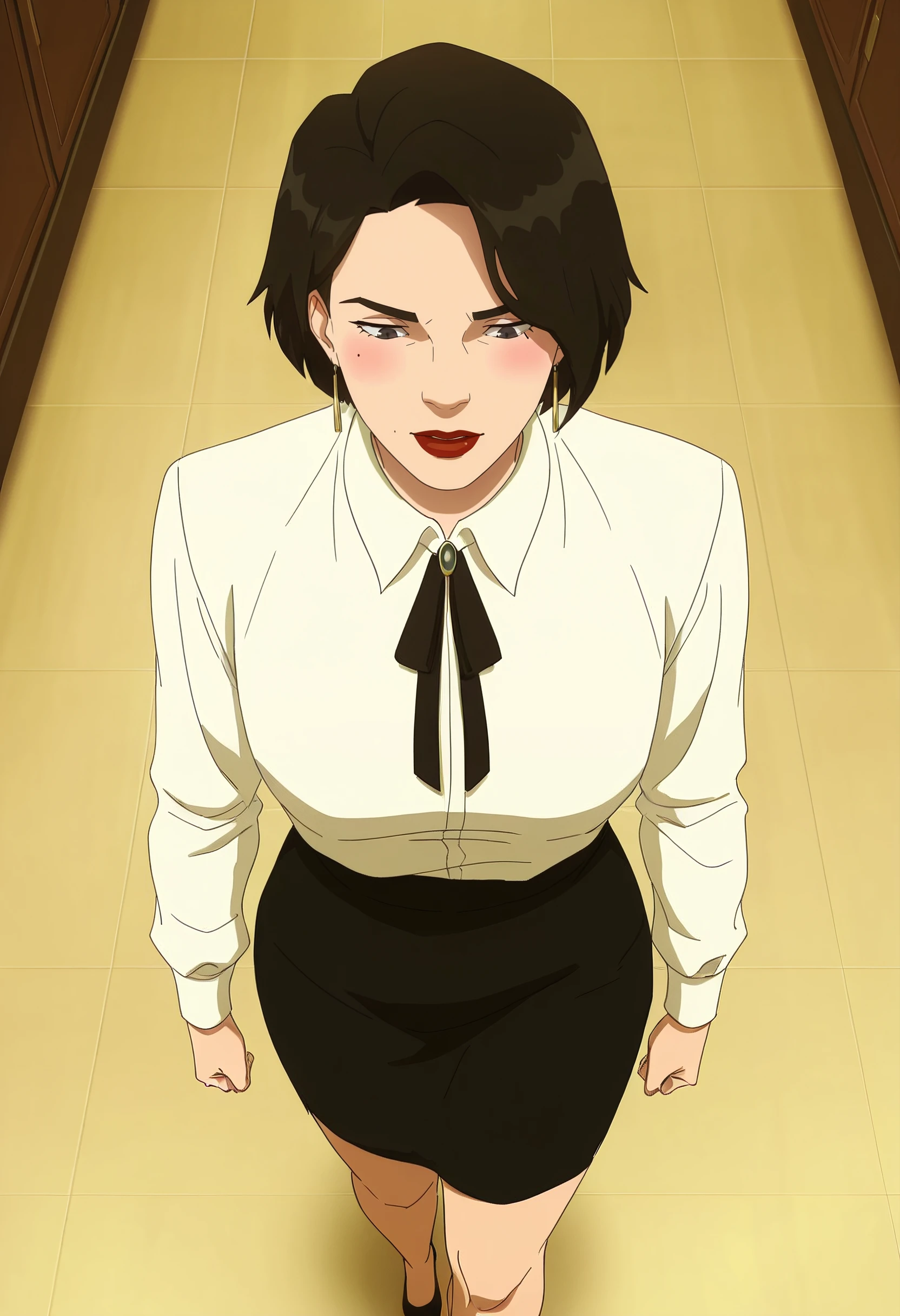 DianaShirt, makeup, shirt, white shirt, collared shirt, lipstick, lips, earrings, wing collar, jewelry, red lips, black neckwear, long sleeves, neck ribbon, ribbon, black ribbon, skirt, black skirt, pencil skirt,