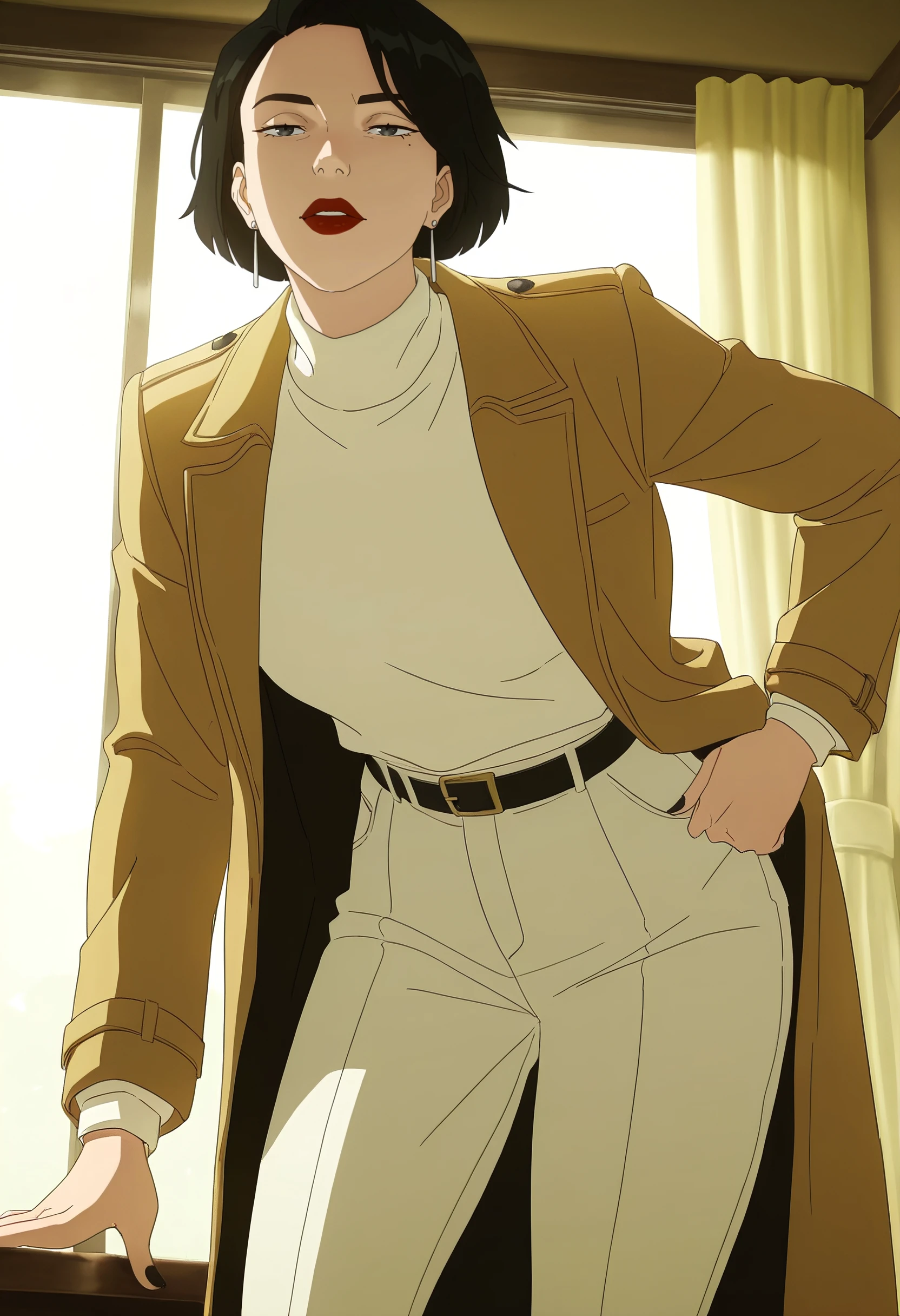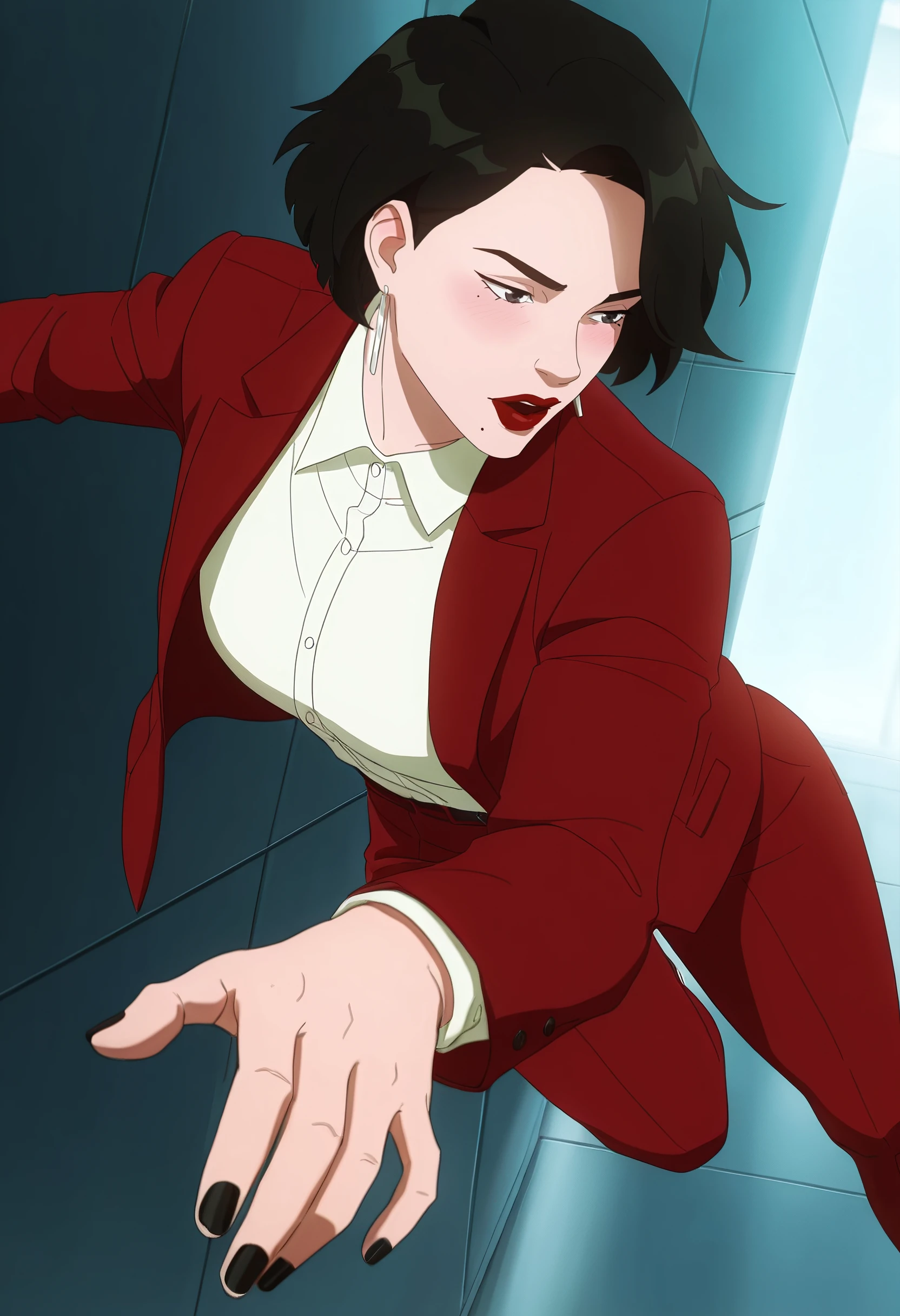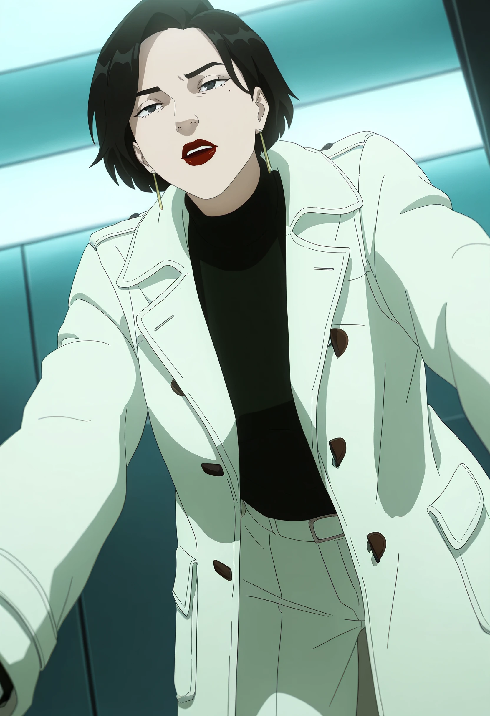 DianaJacket, shirt, long sleeves, red lips, lipstick, makeup, lips, collared shirt, earrings, jacket, jewelry, nail polish, white shirt, black nails, coat, turtleneck, formal, belt, open clothes, open jacket, pants, white pants,
