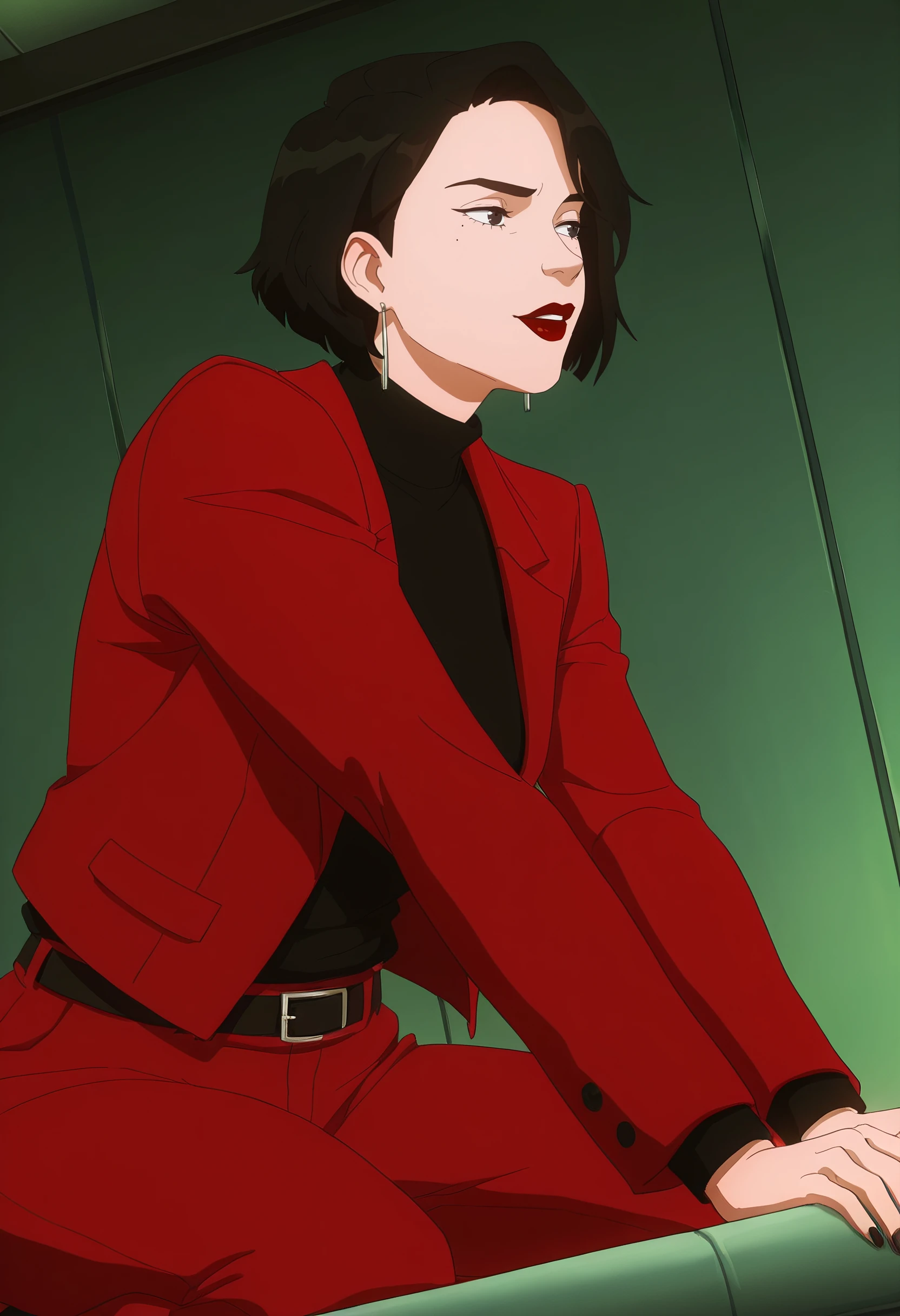 DianaBShirtRJacket, jacket, long sleeves, black shirt, earrings, shirt, jewelry, makeup, turtleneck, black nails, fingernails, nail polish, sweater, open clothes, red jacket, pants, formal, red pants, belt,