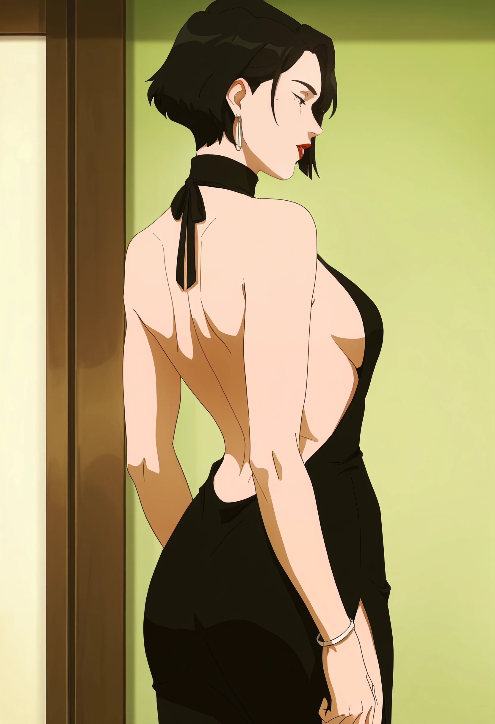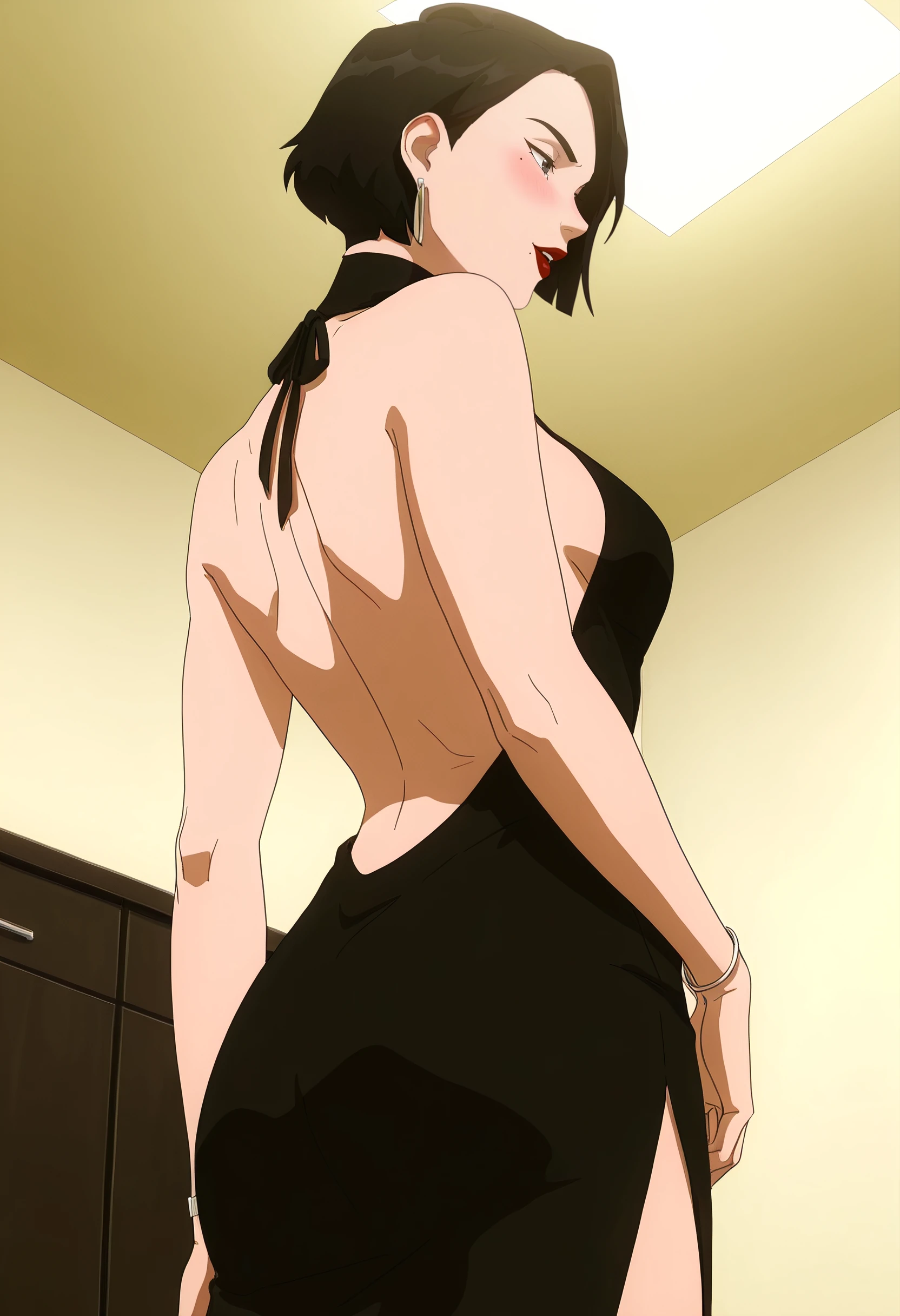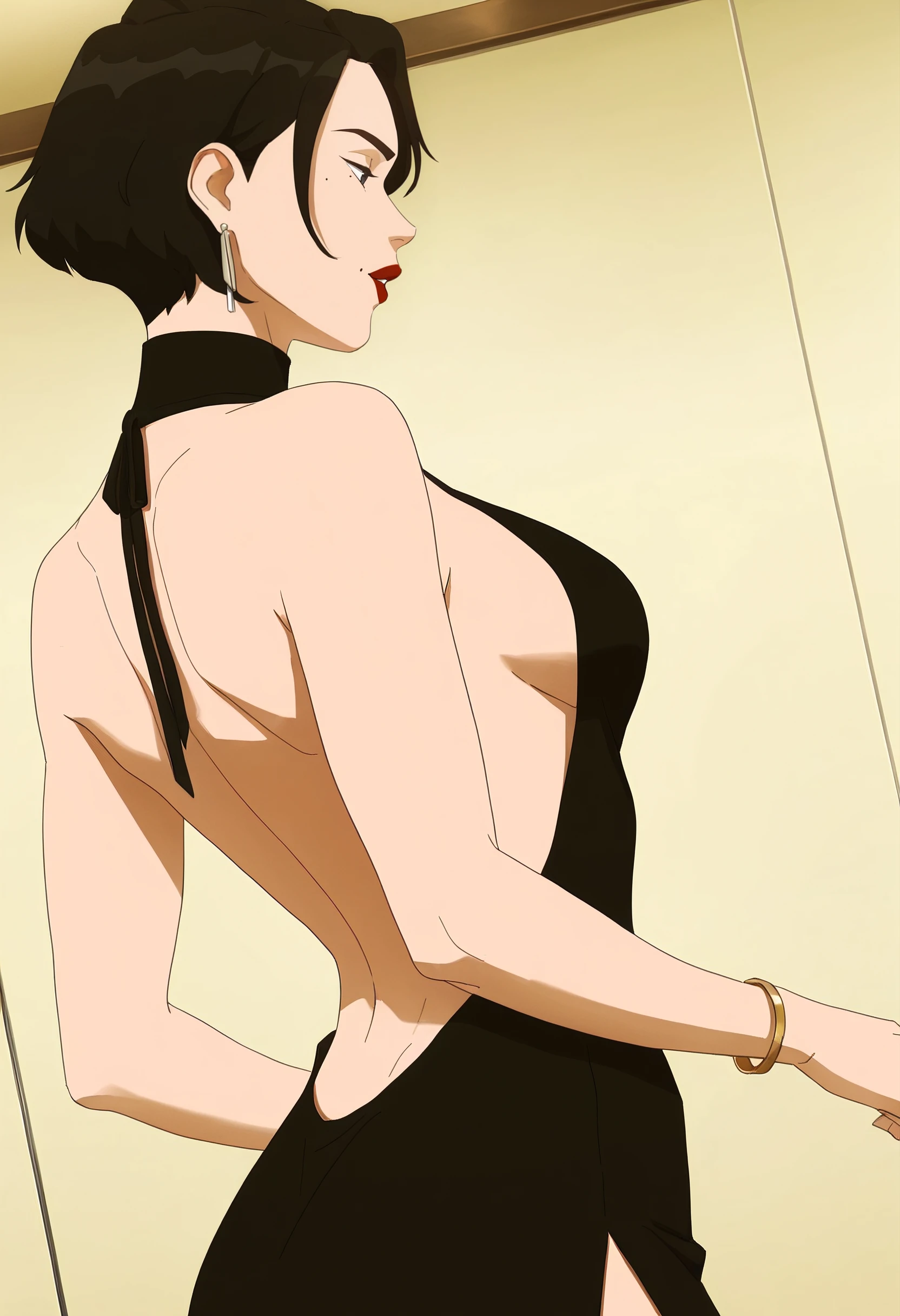 DianaDress, bare shoulders, jewelry, makeup, earrings, lipstick, lips, red lips, sleeveless, dress, bracelet, turtleneck, black dress, backless outfit, sideboob, bare back, eyeshadow, backless dress, halterneck,