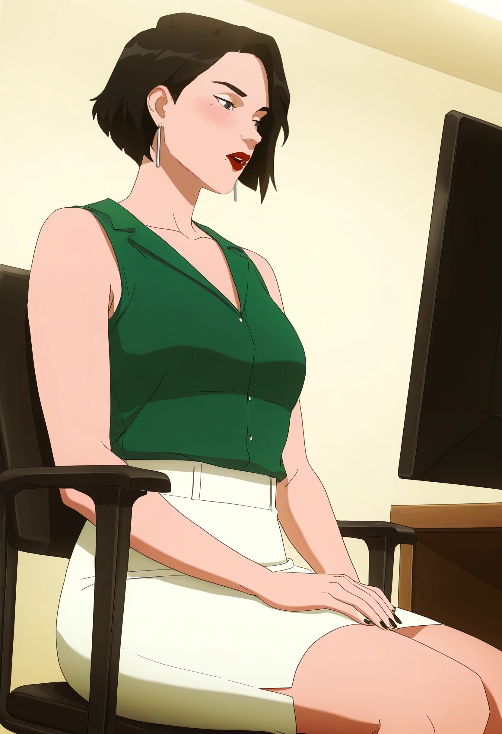 DianaSweater, shirt, earrings, jewelry, collarbone, lips, green shirt, lipstick, makeup, sleeveless, bare shoulders, sleeveless shirt, bare arms, skirt, white skirt, pencil skirt,
