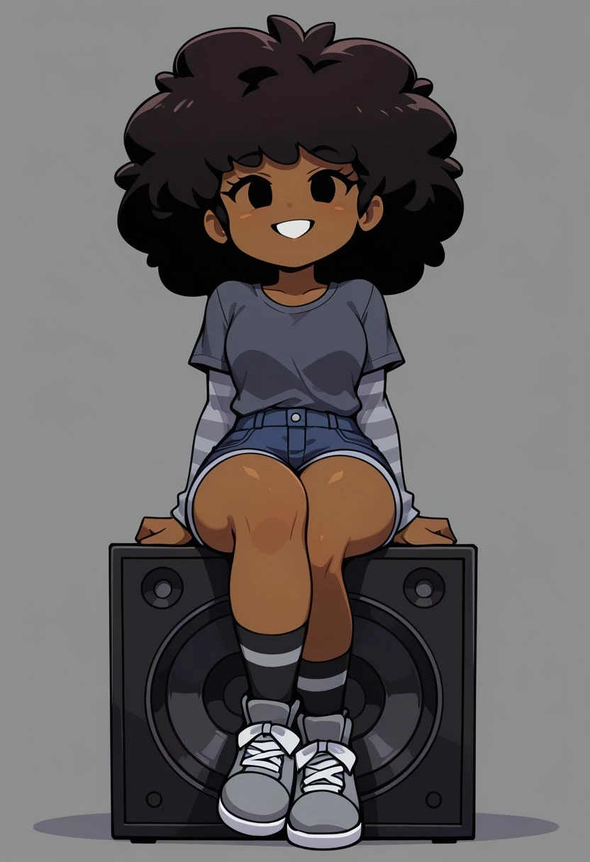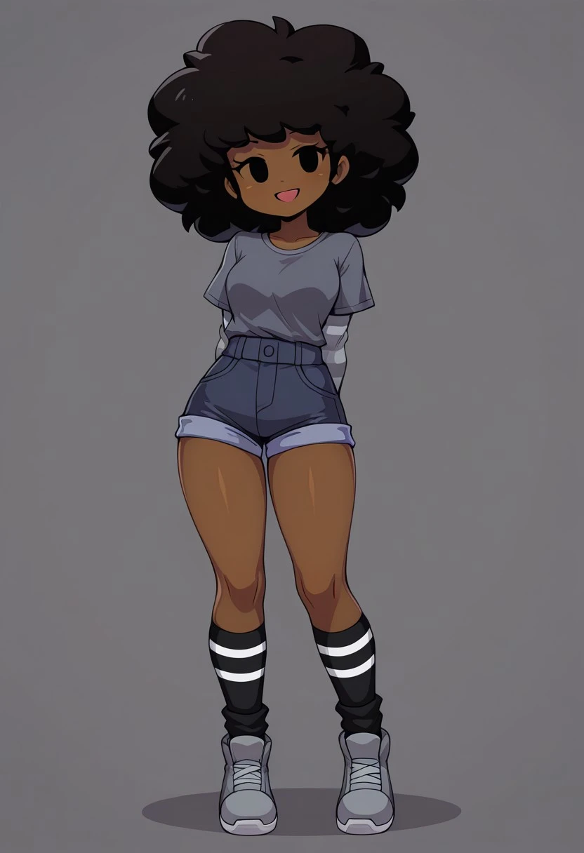 Carol (fnf), dark skin, dark-skinned female, black eyes, no sclera, afro, black hair, shorts, big hair, shirt, striped black socks, grey and white shoes,