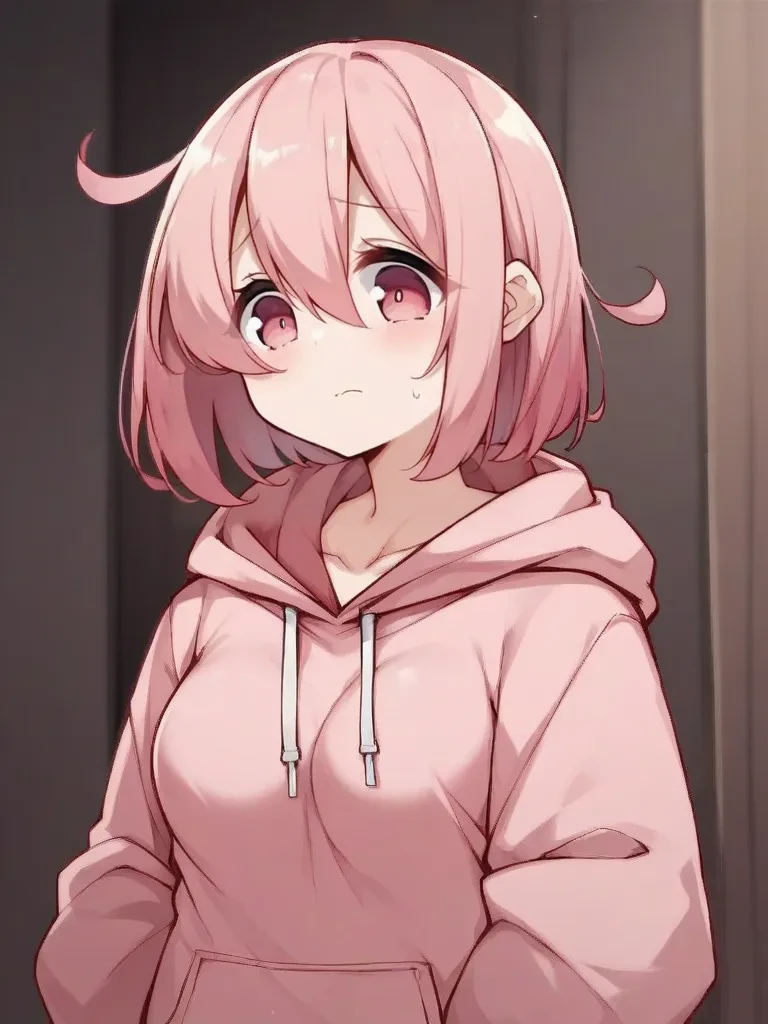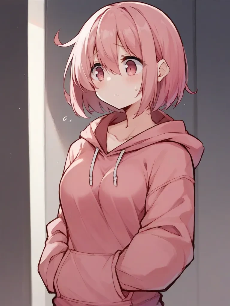 keywords: pink hair, short hair, pink eyes, pink shirt, hoodie