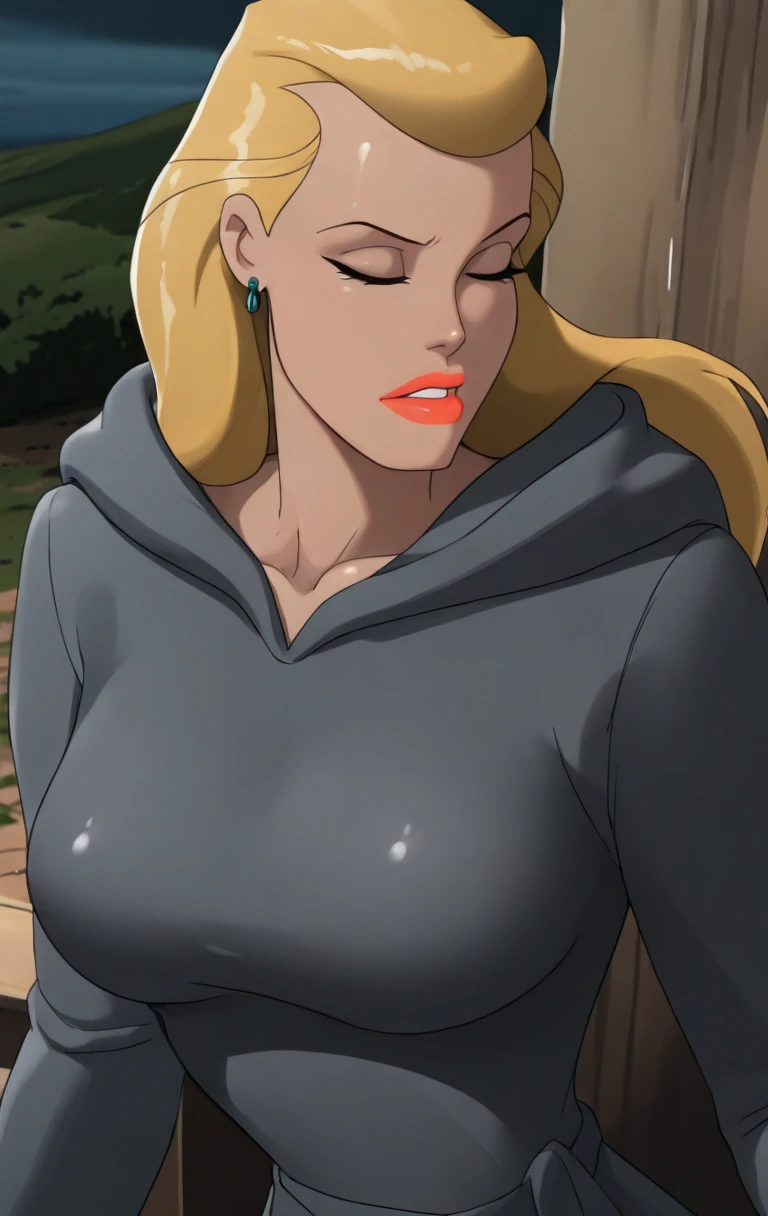 s3l1n4kyle, 1girl, long hair, breasts, blonde hair, medium breasts, closed eyes, outdoors, earrings, parted lips, hood, lips, night, hoodie, hood down, grey hoodie