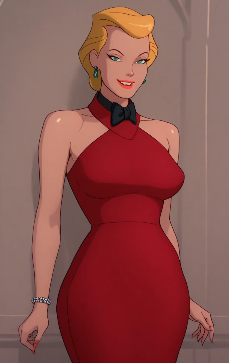 s3l1n4kyle, 1girl,solo, breasts, looking at viewer, smile, short hair, dress, jewelry, bare shoulders, standing, green eyes, yellow hair, bow, earrings, parted lips, formal, red dress, bowtie, bracelet, formal attire, tuxedo, black bowtie