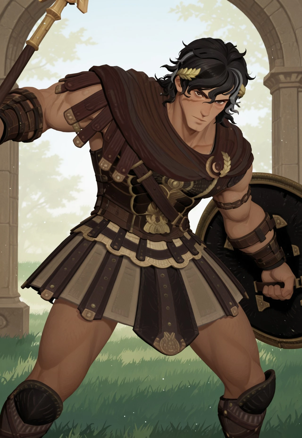 P3RS3USAFK, messy hair, Black hair, medium length hair, two-tone hair, grey hair, muscular male, brown eyes, leather greek armor, brown leather armor, shoulder cape, short cloak, one-shoulder cape, battle skirt, pleated skirt armor, strapped sandals, gold laurel crown, brown skin, leather bracers, knee greaves