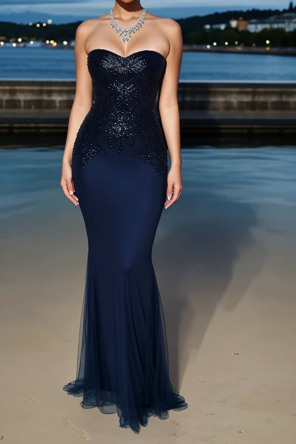 blue strapless dress, bare shoulders, full body, necklace