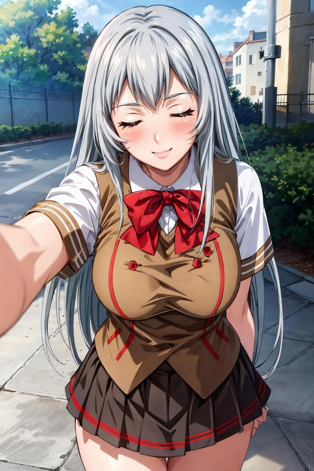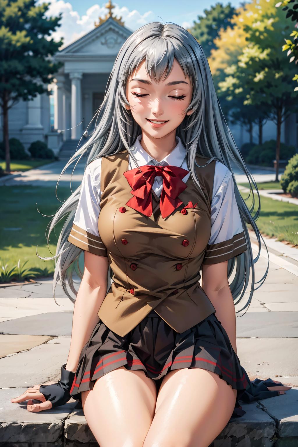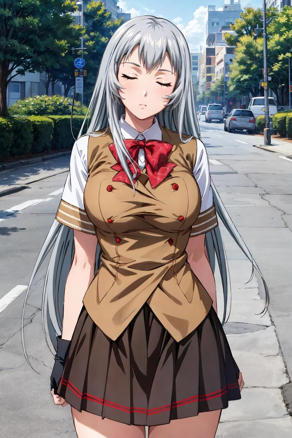 shiryuuwz, very long hair, closed eyes, school uniform, pleated skirt, miniskirt, grey hair, large breasts, fingerless gloves, short sleeves, bowtie, shirt, vest